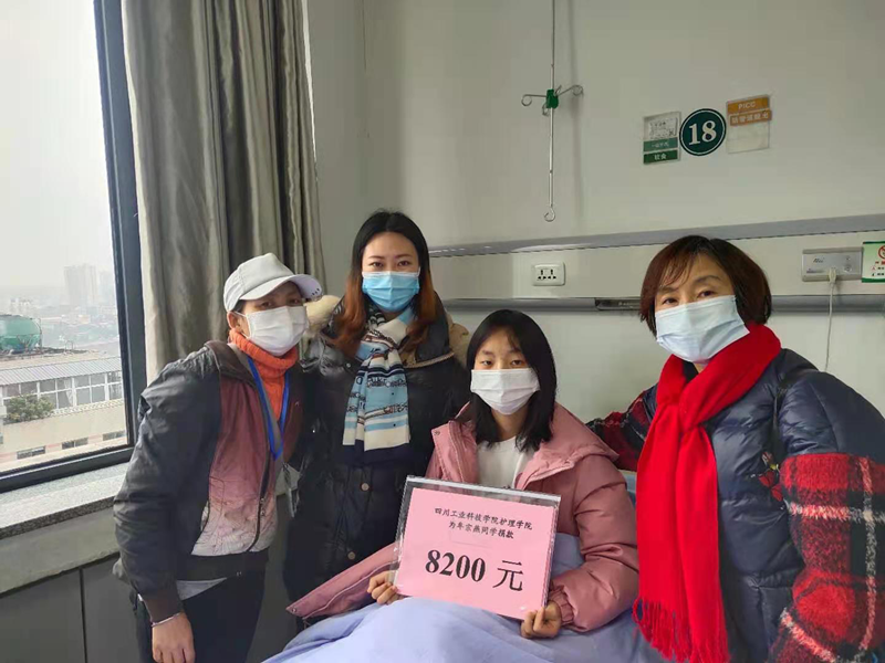 二级学院得知情况后,党政主要领导高度重视,在第一时间做出指示,一是要求班级辅导员立即组织班委干部前往医院探望;二是为了帮助牟宗燕同学闯过难关,护理学院党总支和团总支共同发起募捐倡议(通过现金捐赠和“水滴筹”等方式募集资金),呼吁大家贡献一份爱心,为帮助同学战胜病魔、早日康复、重返校园,贡献一份微薄的力量。三是学院院长陆春桃和党总支副书记李双晶,十分关心学生的病情,多次通过电话了解情况。今日带着护理学院全体师生和社会各界人士的爱心,送去近日捐赠的现金8200元人民币和“水滴筹”募集的资金3万余元人民币。