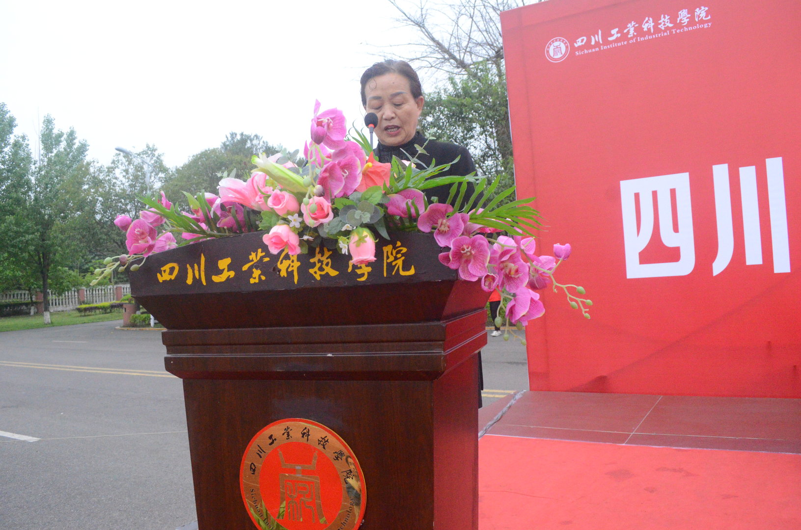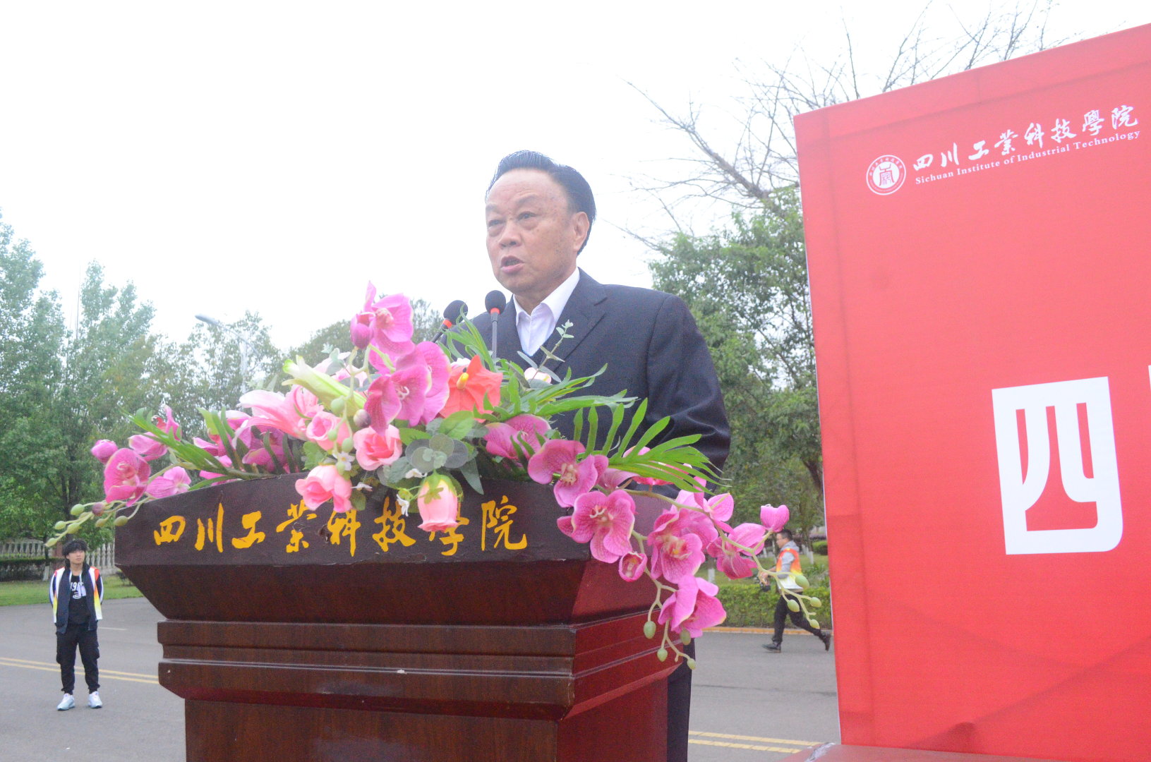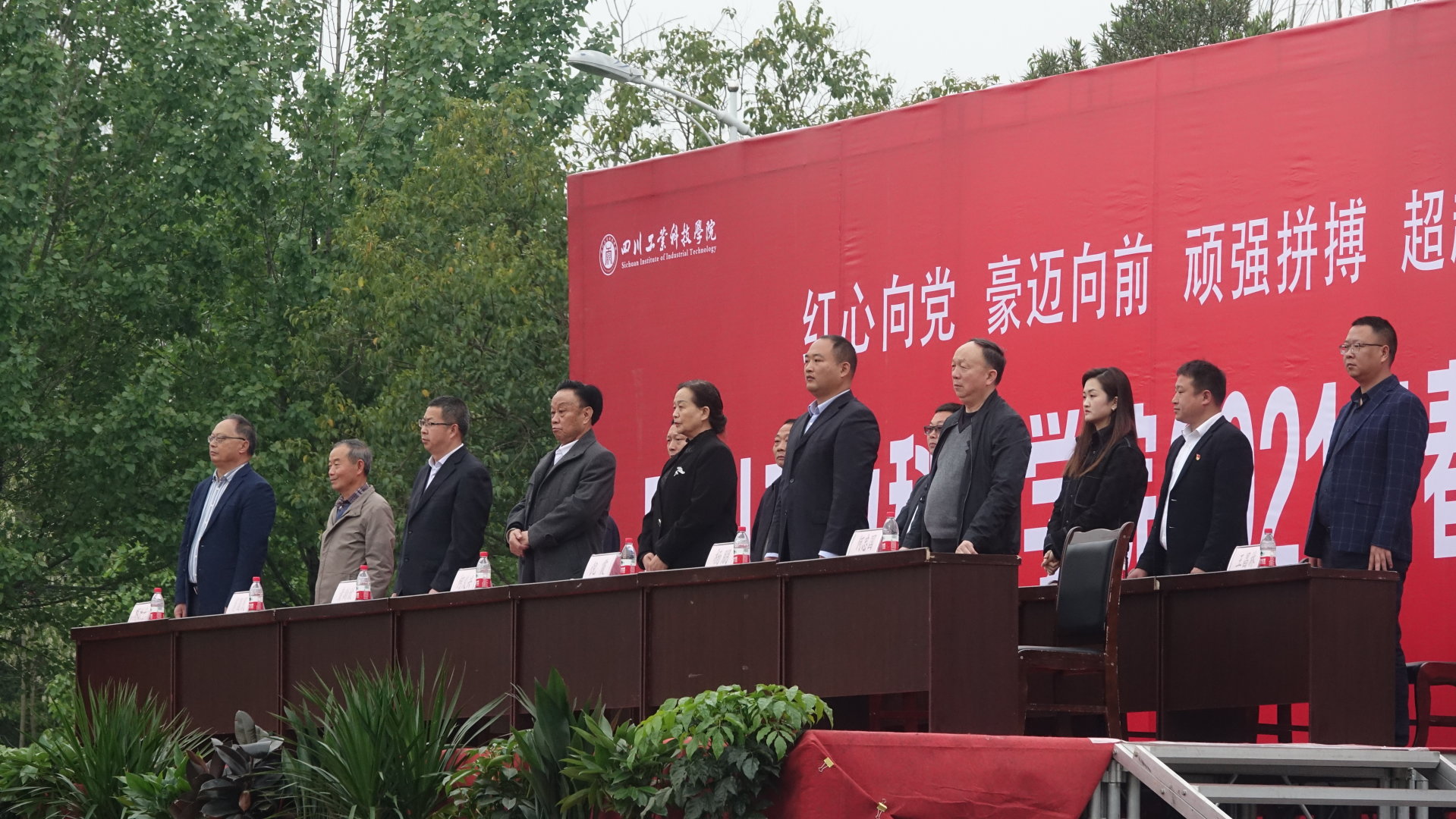 (图为学校副校长何义兴宣布四川工业科技学院 2021 年春季运动会正式开幕)
