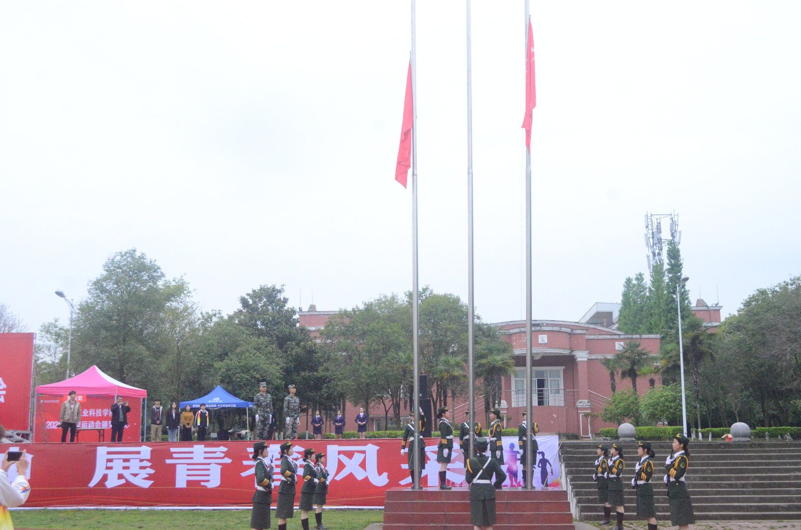 4 月 15 日上午 9:00,四川工业科技学院绵竹校区 2021 春季运动会在足球场隆重开幕。学校副校长何义兴、学校党委副书记倪霞、副校长黄斯欣、校长助理杨朋,各部门负责人及绵竹校区管委会成员等出席开幕式。