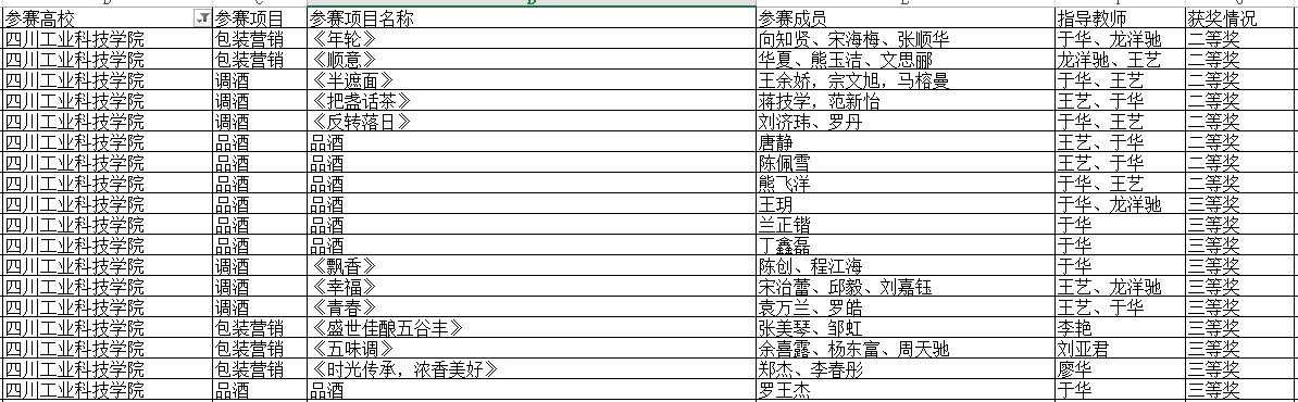 本次大赛为四川省教育厅批复的大学生学科竞赛,旨在为教师提供学术交流的平台,促进学生基础理论知识和实践创新创意能力的培养,展现师生勠力同心、坚持不懈的精神风貌。我校食品学院学生在以于华、王艺等专业老师的指导下,共选拔20组学生代表学校参加了品酒、调酒和包装营销等赛道比赛。我校学生与来自四川大学、四川轻化工大学、四川师范大学、西南石油大学等省内32所高校的300余名学生同台竞技,充分展现了四川工业科技学院学子谦虚谨慎、技艺出众、团结奋进、合作共赢的良好状态。在比赛中,我校食品学院参赛队伍奇思妙想的创意作品展现了酒类创新的无限可能,在众多参赛队伍中脱颖而出,斩获二等奖8项,三等奖10项,学校被评授予优秀组织奖。