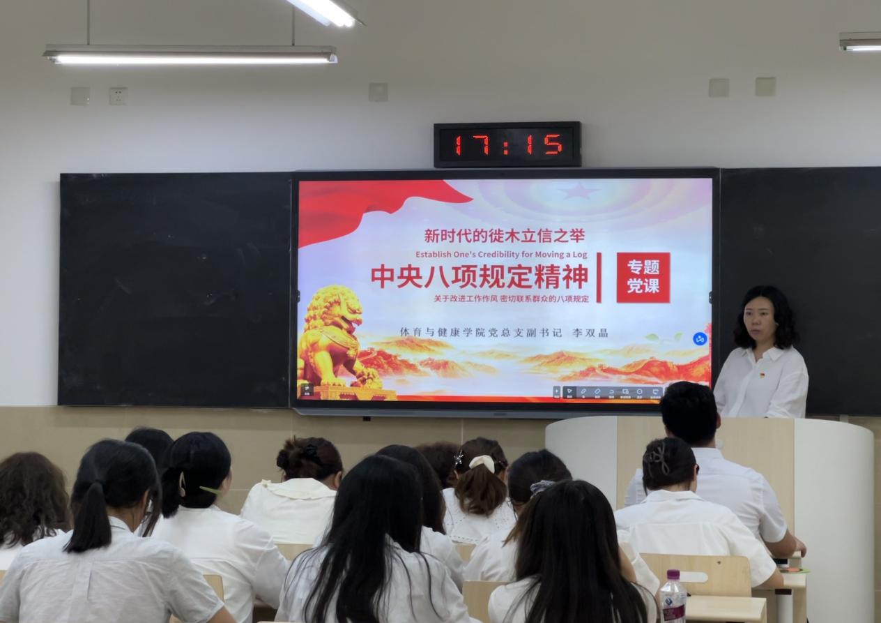 5月19日,体育与健康学院在龑江B206教室召开“深入学习中央八项规定精神”为主题的专题党课。本次党课由学院党总支副书记李双晶主讲,护理系第一、第二党支部全体党员参加。