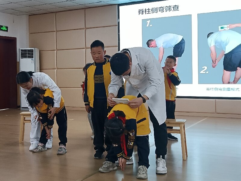 讲座伊始,刘高老师给同学们讲授脊柱形态的相关知识,同学们听得格外认真,积极与老师互动。经过讲解,同学对脊柱侧弯有了一定了解,大家纷纷提出问题,刘老师详细解答。最后,刘老师对小朋友进行脊柱侧弯的筛查。