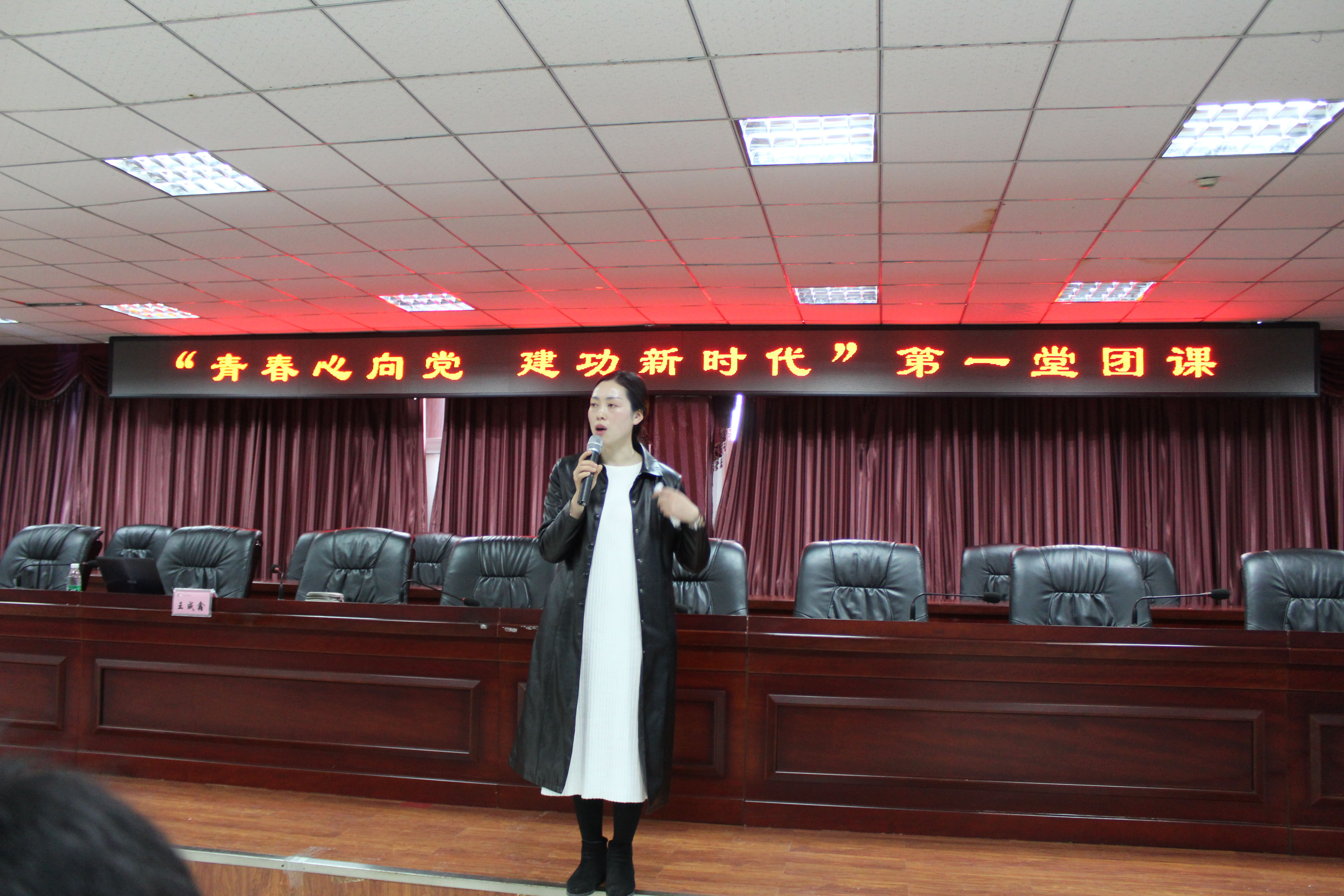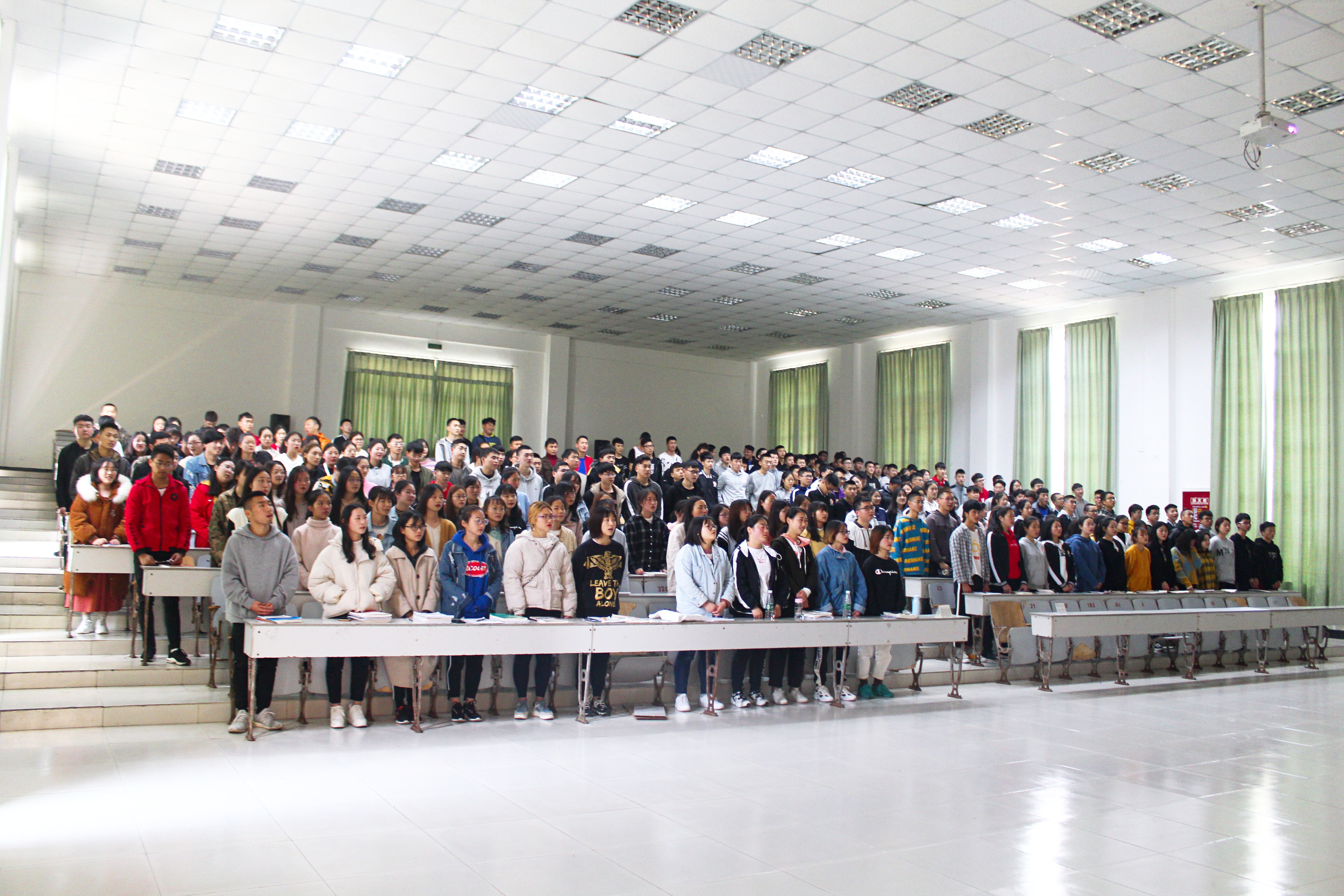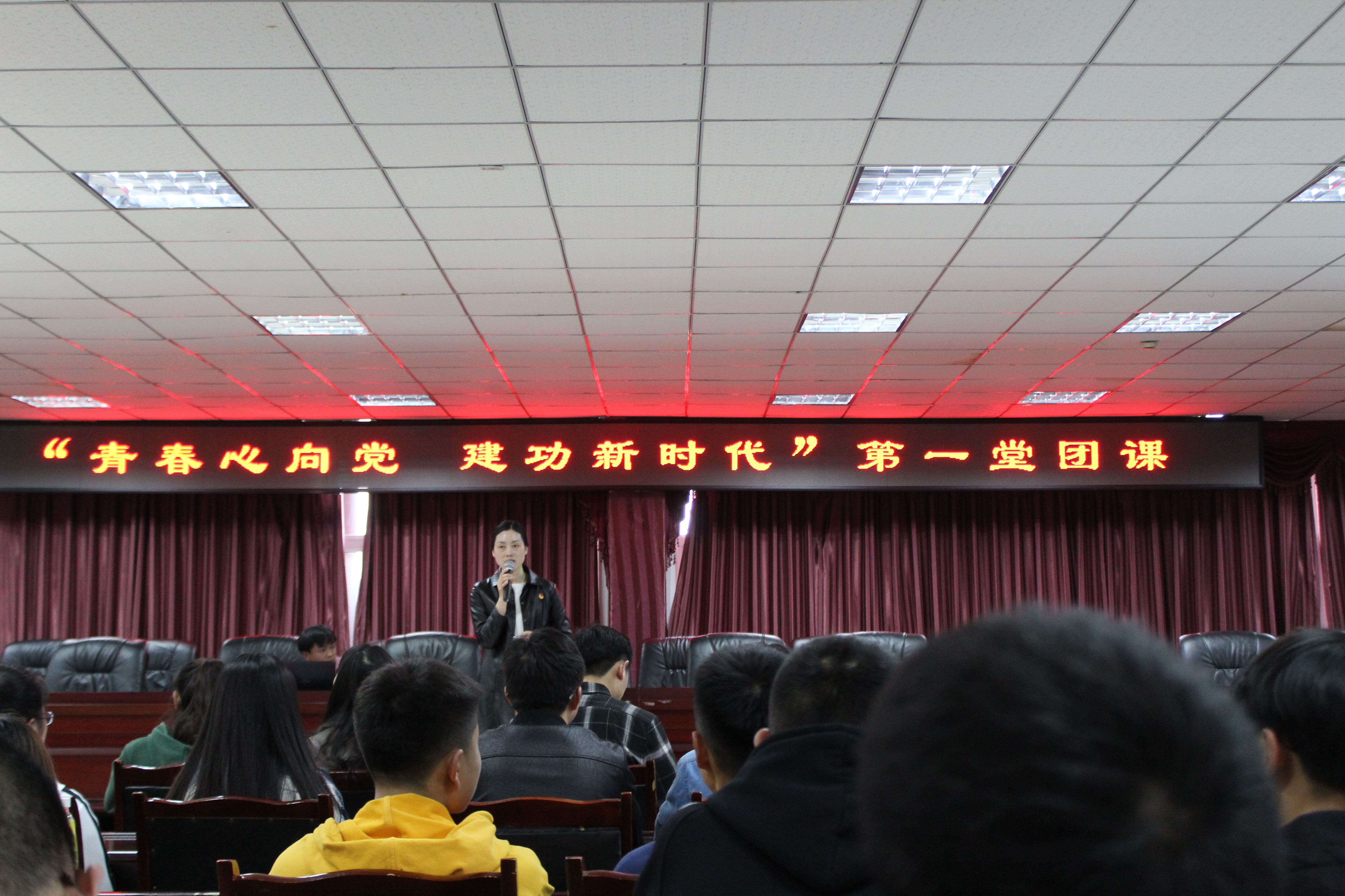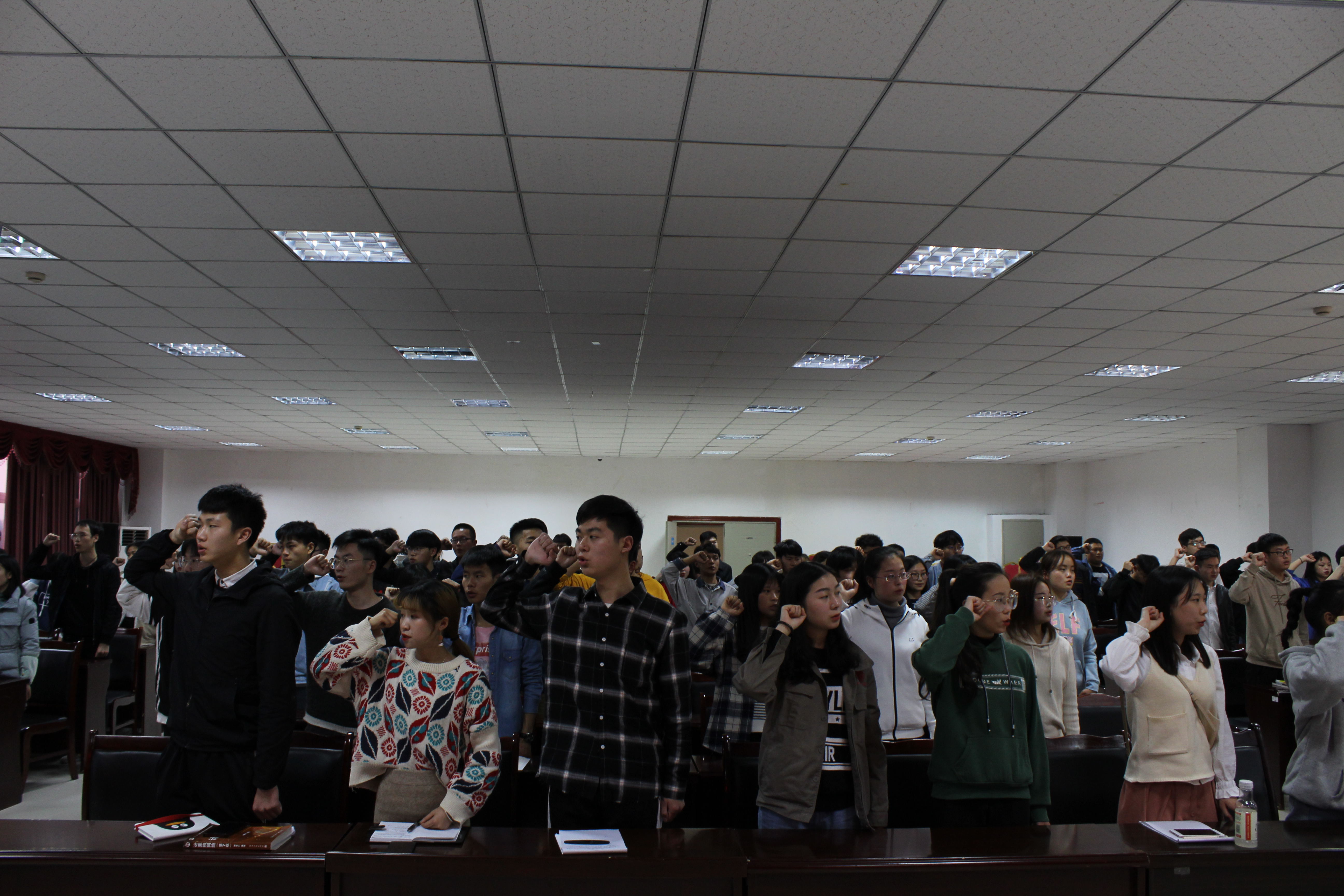 课堂上,王书记从基本的团知识出发,以提问、讨论等方式,逐渐引导,层层递进,其生动形象化的言语,使同学们多角度、多方面对团有了更深的了解,同时也使得课堂的气氛活跃起来。全体在场人员肃立并奏唱的团歌“光荣啊,中国共青团”响彻整个教学楼,余音绕梁,响彻耳畔。