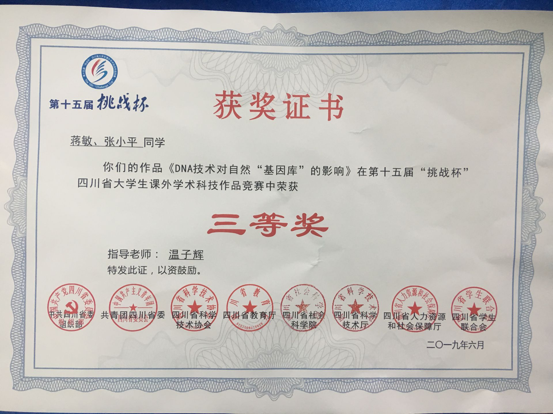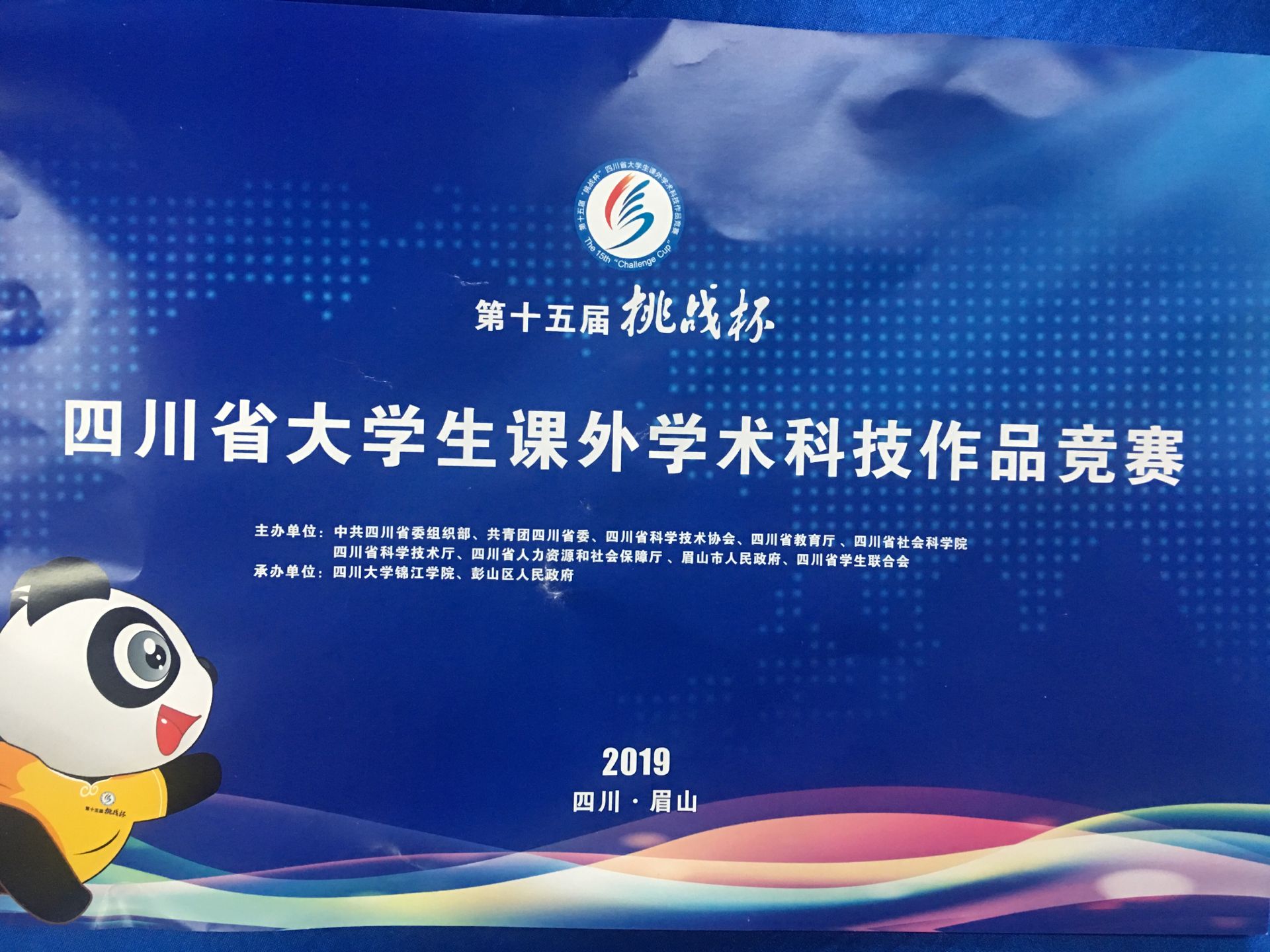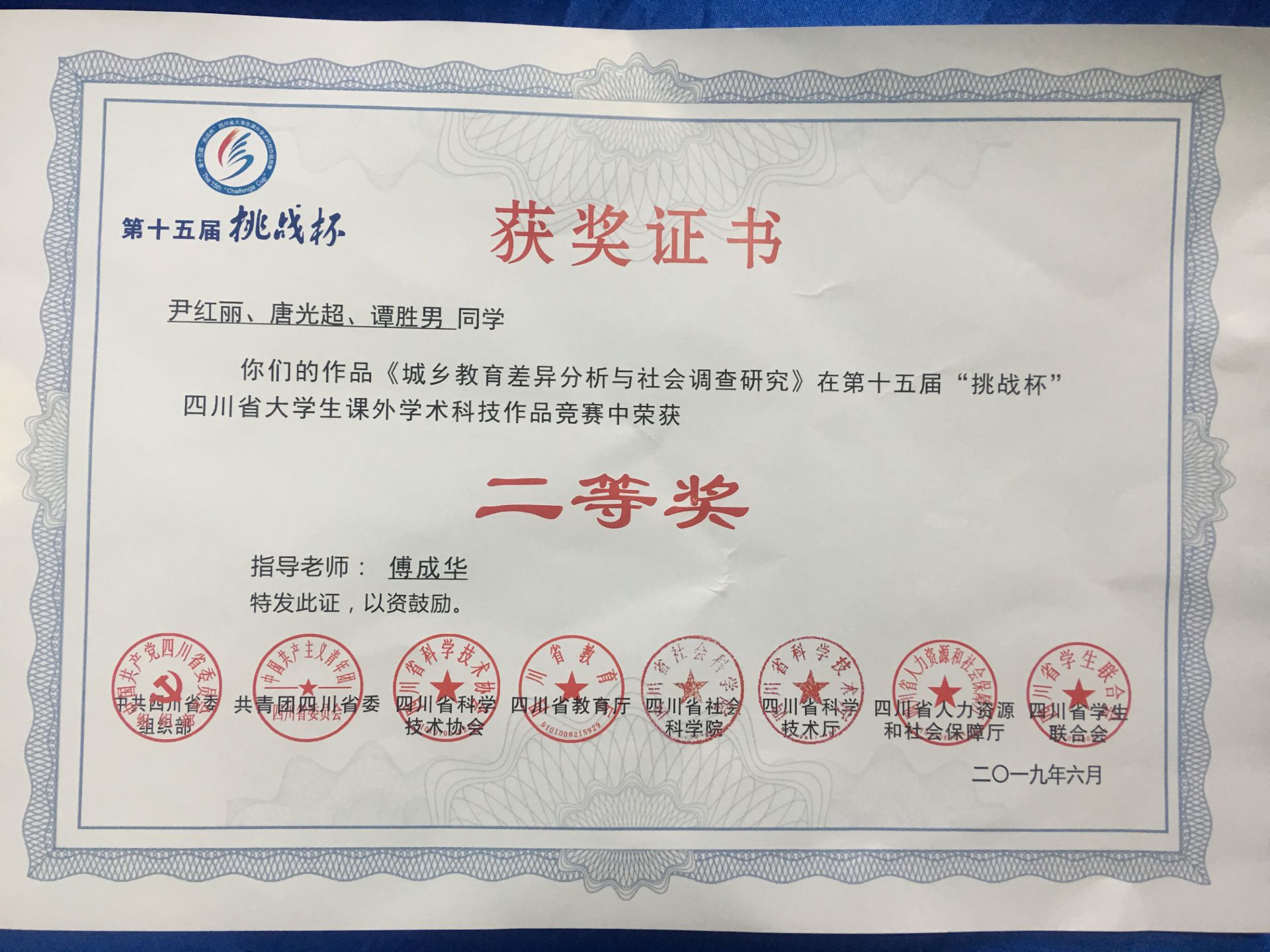 2019年6月,第十五届挑战杯四川省大学生课外学术科技作品竞赛中,我校学生尹红丽、唐光超、谭胜、蒋敏、张小平五位同学斩获佳绩。其中尹红丽、唐光超、谭胜三位同学的参赛作品《城乡教育差异分析与社会调查研究》荣获挑战杯二等奖;蒋敏、张小平两位同学的参赛作品《DNA技术对自然“基因库”的影响》荣获挑战杯三等奖。