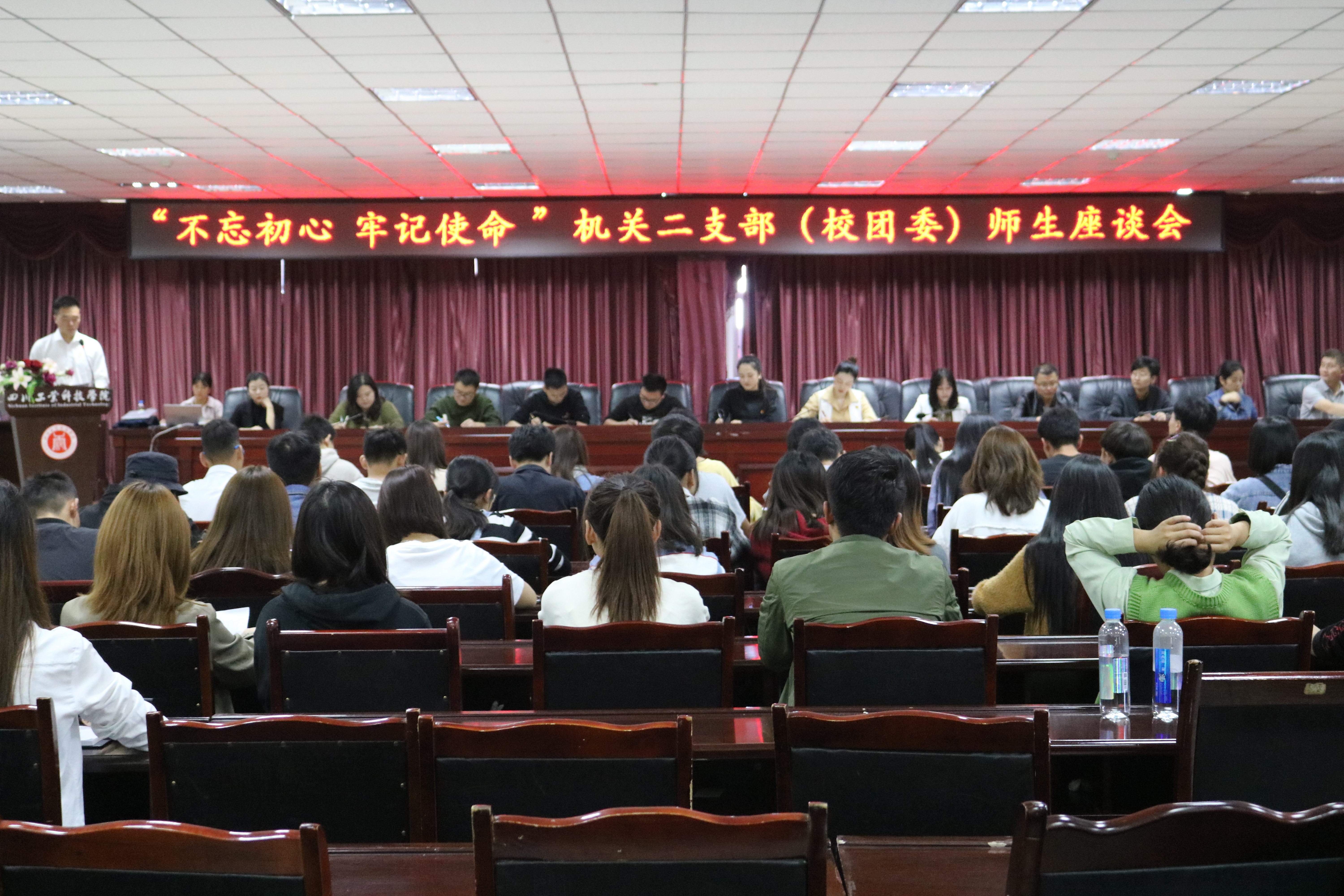 根据支部“不忘初心、牢记使命”主题教育方案,机关第二党支部(校团委)在图书馆D-08室召开师生座谈会。机关二支部副书记王成鑫、组织委员张旭彬、宣传委员代芷榆,校团委挂职副书记何彬、曾晓莉、邓杰、蒋冰梅,工会小组组长华裔伊及各二级学院团总支书记、学生代表参加。