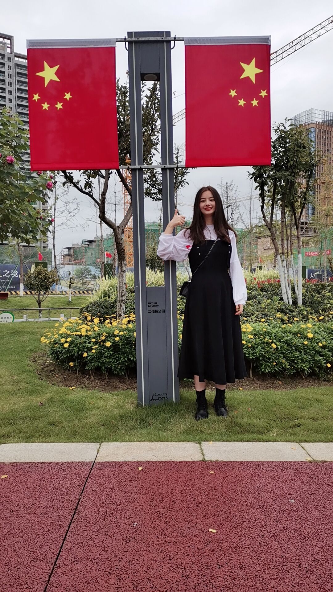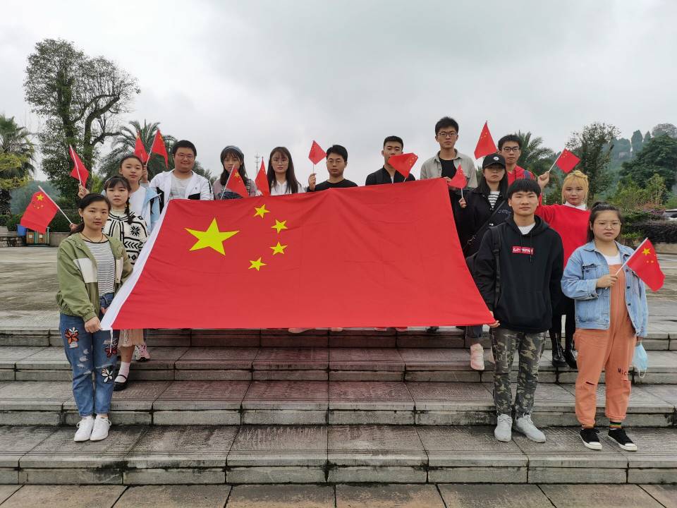 二、开展“我与国旗合个影”活动。学生通过自发选取不同地点,通过创意的姿势和独特的拍摄角度,来与国旗合个影,表达学生对国旗的无比热爱和对祖国母亲的深切祝福。