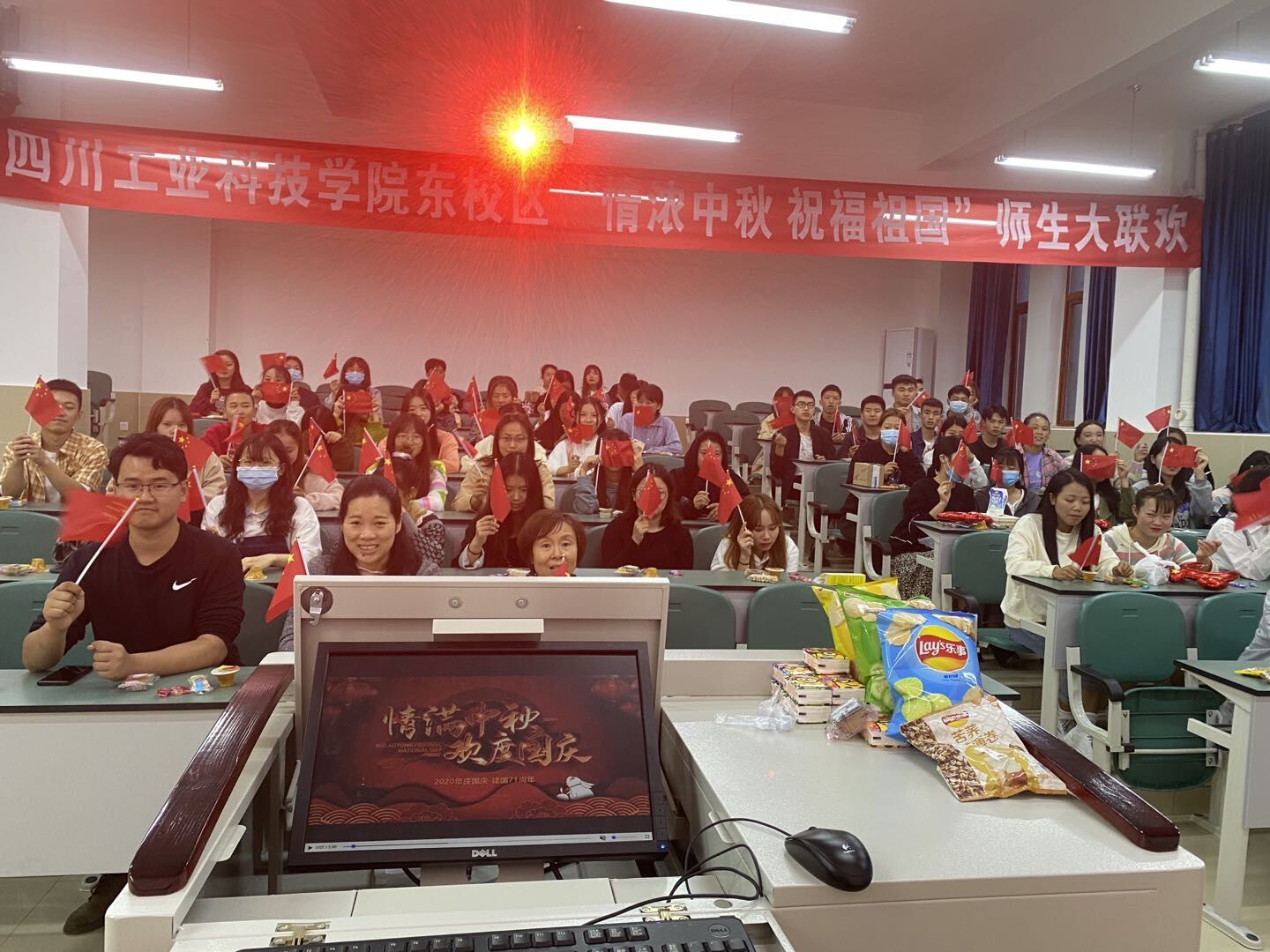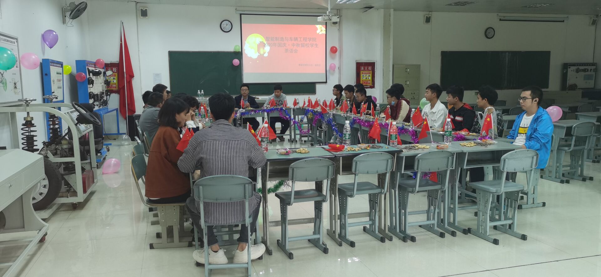 四、开展“庆国庆,迎中秋”茶话会活动。在学院老师的组织下,举行“庆国庆,迎中秋”、“我和我的祖国”等主题的茶话会活动。各学院充分利用多媒体等系统,让学生充分了解祖国历史,聆听一曲曲振奋人心的祖国颂歌,增强了学生们的爱国情感。