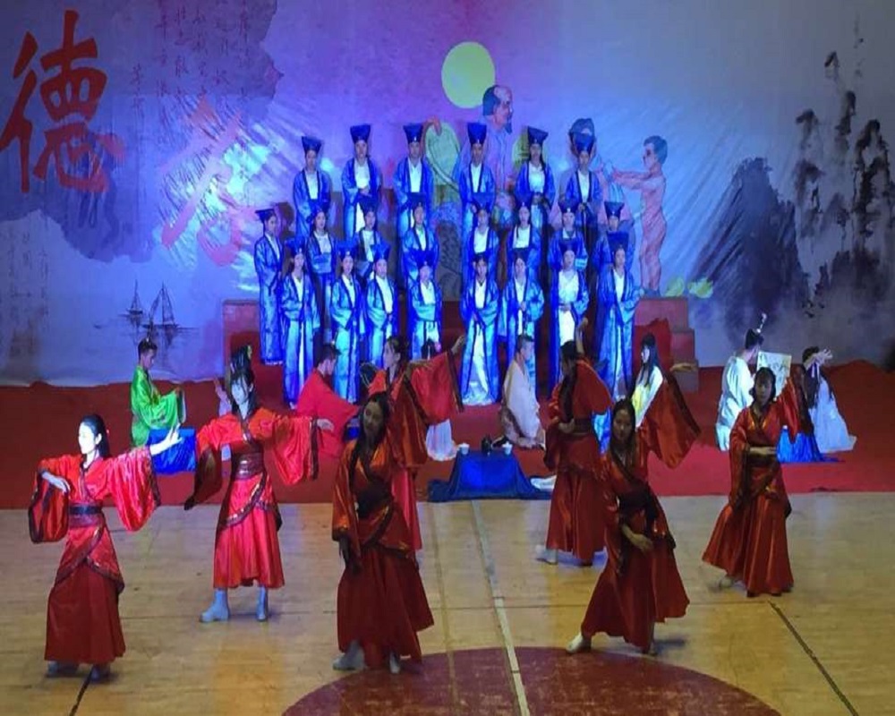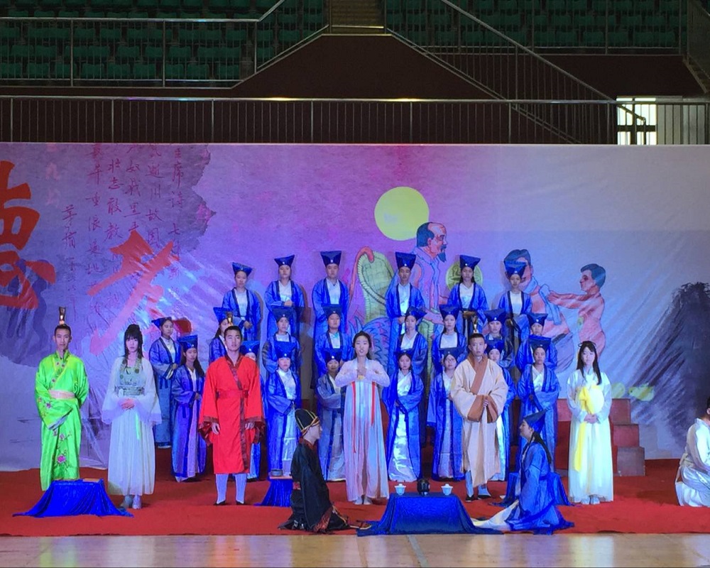 置身于演出现场,身着古装的同学们抑扬顿挫地朗诵着德孝诗词,手中毛笔挥洒出遒劲有力的德孝诗篇,让人仿佛回到千年以前,在悠远的歌声中慢慢触碰那亘古不变的德孝精神和我国的经典传统文化。一袭红衣的舞者迎着背景音乐翩然起舞,将演出氛围推向高潮。