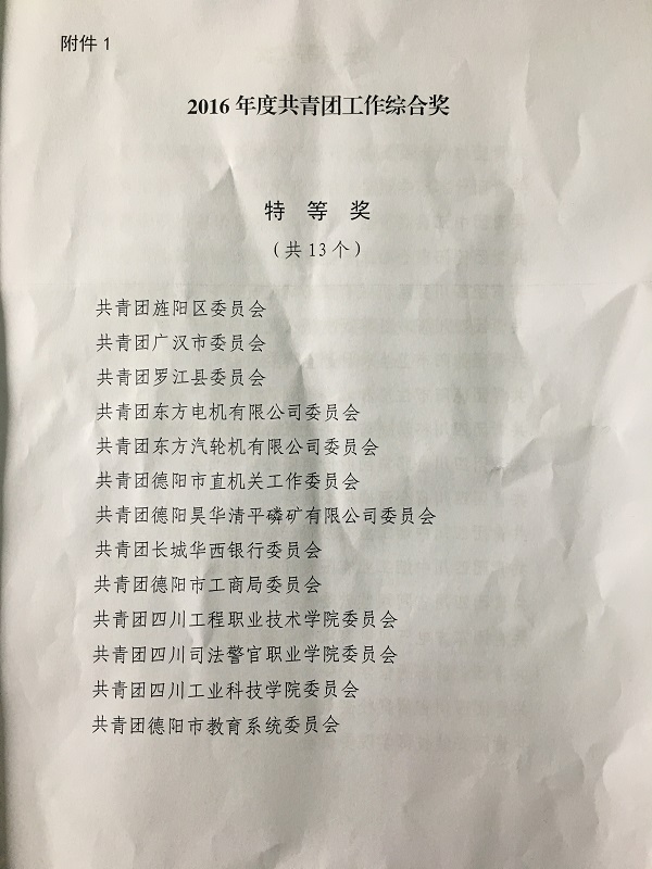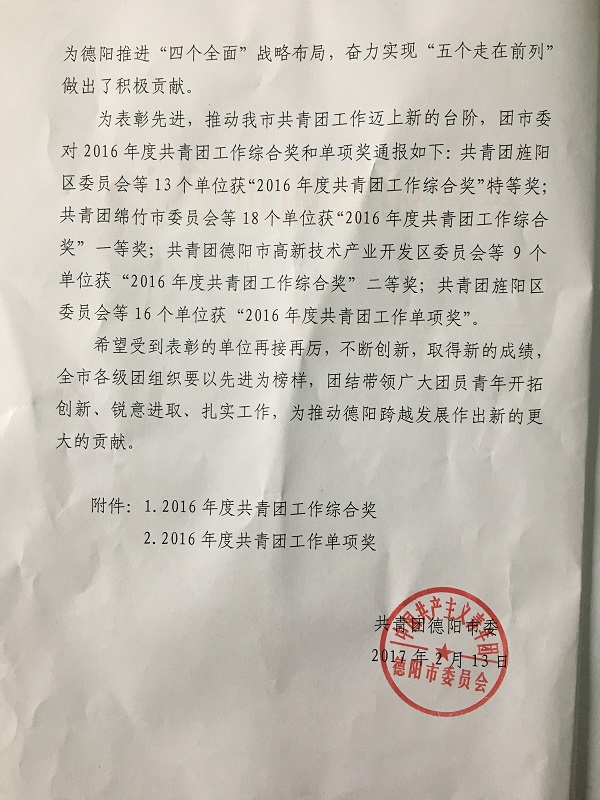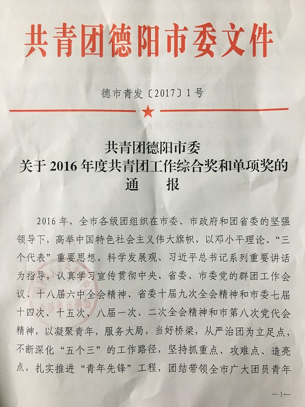 我校团委荣获德阳市2016年度共青团工作综合奖“特等奖”