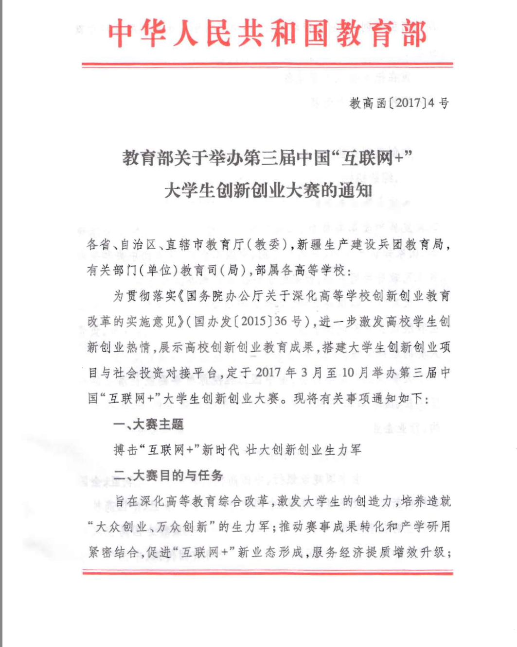教育部关于举办第三届中国“互联网+”大学生创新创业大赛的通知