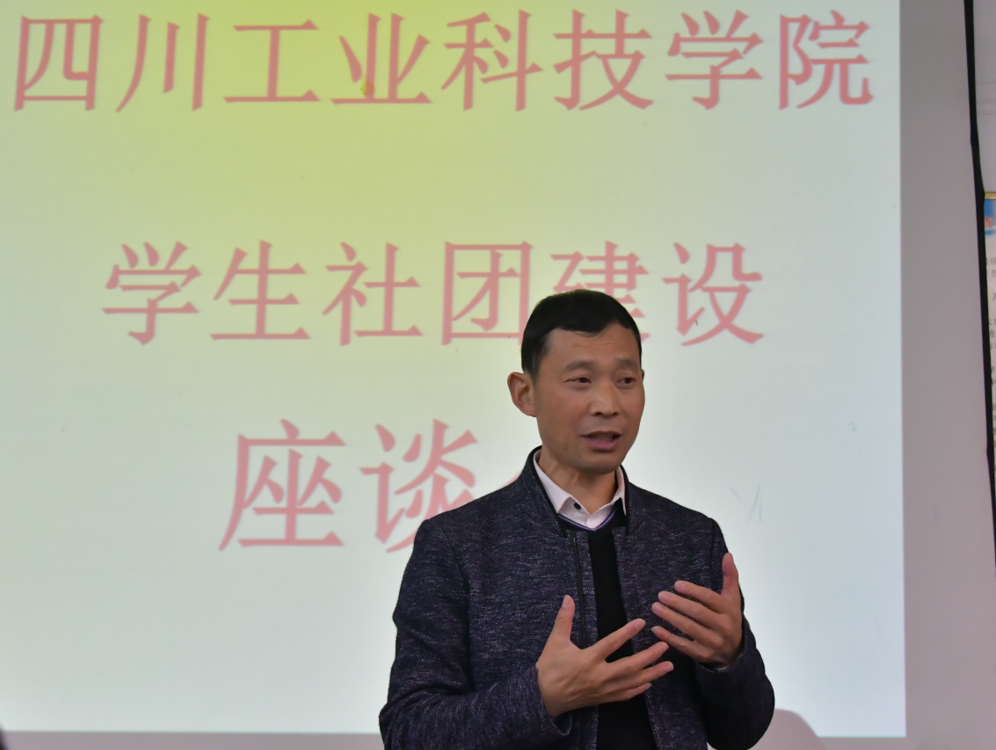 2018年11月12日四川工业科技学院“学生社团建设座谈会”在毓秀101召开。出席本次会议的领导老师有:学校党委书记魏崛,党委学工部部长、学生处处长邓成奉,团委副书记王成鑫,团委李东宇老师,安保处处长杨勇,党委宣传部部长罗岚兰,大学生艺术团副团长张斌、曾晓莉。以及学团联全体成员和各社团负责人。