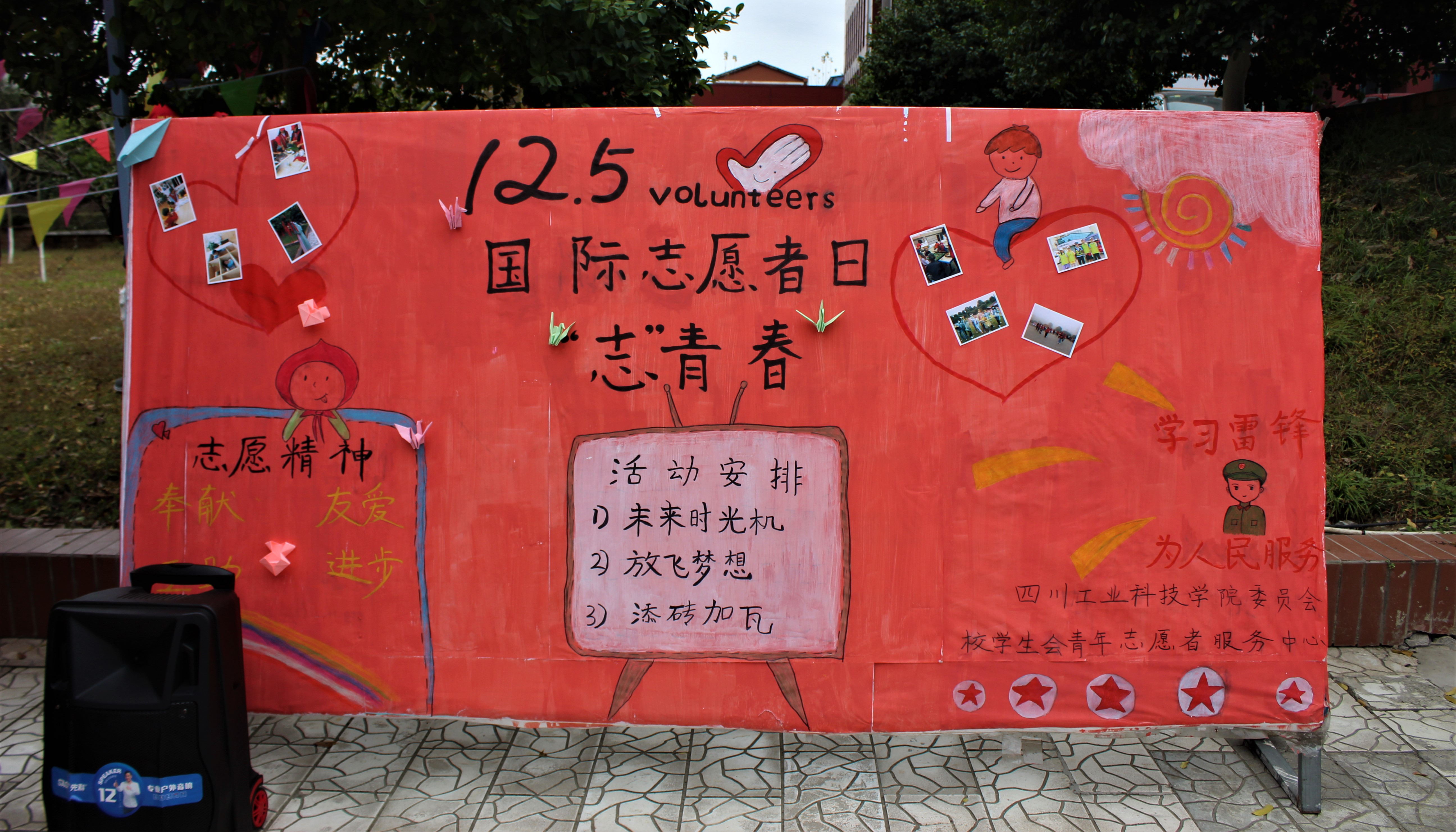 为纪念第33个国际志愿者日,呼吁更多的青年加入志愿者行列,弘扬志愿服务精神,传播社会正能量。125日,由共青团四川工业科技委员会主办,校学生会青年志愿者服务中心承办的“12.5?志青春”志愿服务活动在我校百汇广场成功开展。