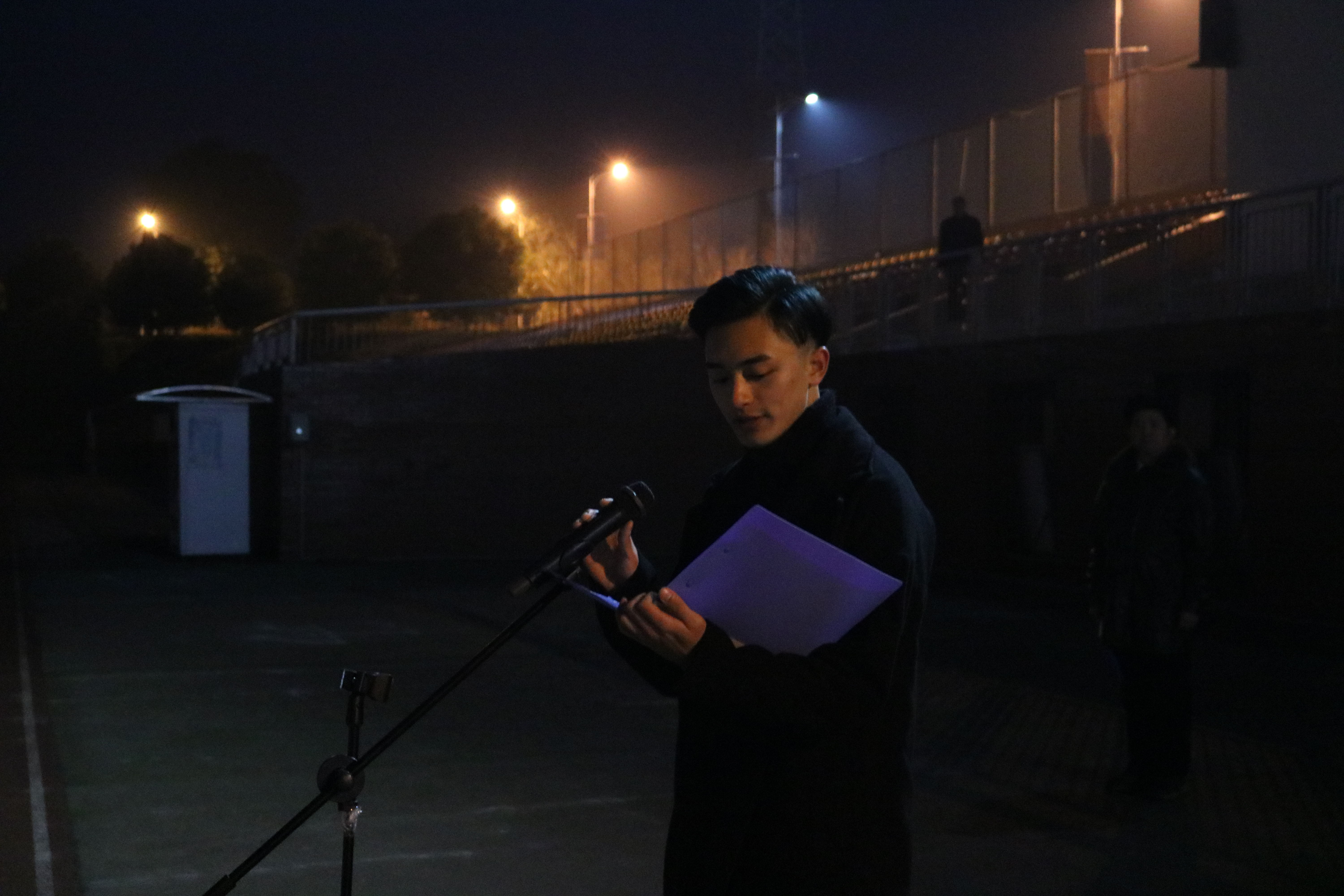 在鲜艳的五星红旗下,学生代表程前龙发言,在感谢母校为同学们提供优良的学习生活环境的同时,他希望同学们脚踏实地、谦虚自立、心怀感恩。