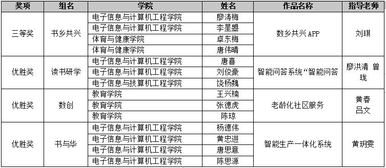 活动自4月启动以来,我校图书馆认真组织,鼓励师生积极参与。经过初赛、复赛层层选拔,我校学生作品《数乡共兴APP》荣获三等奖,《智能问答系统“智能问答》、《老龄化社区服务》、《智能生产一体化系统》荣获优胜奖,图书馆荣获优秀组织奖。