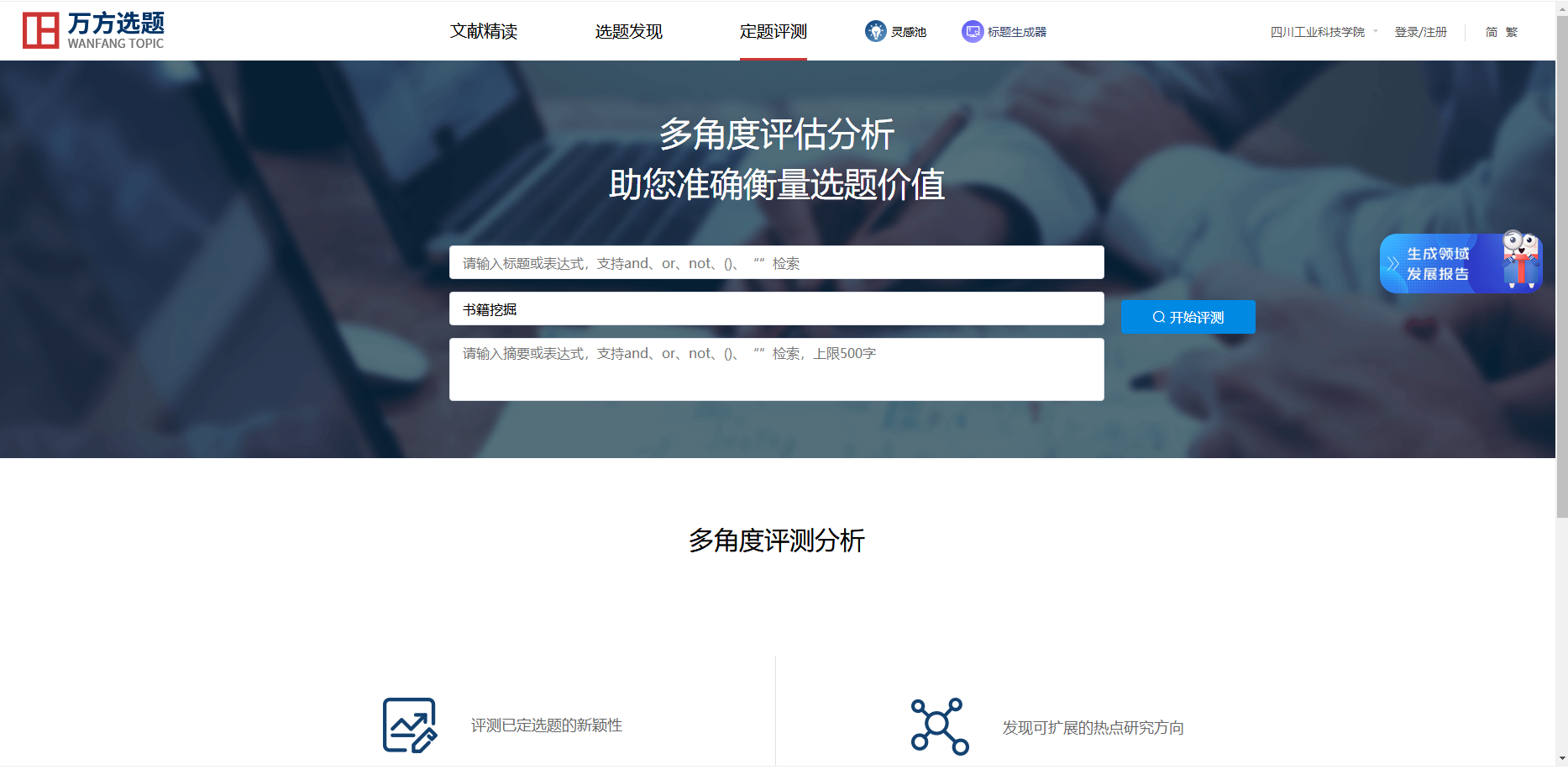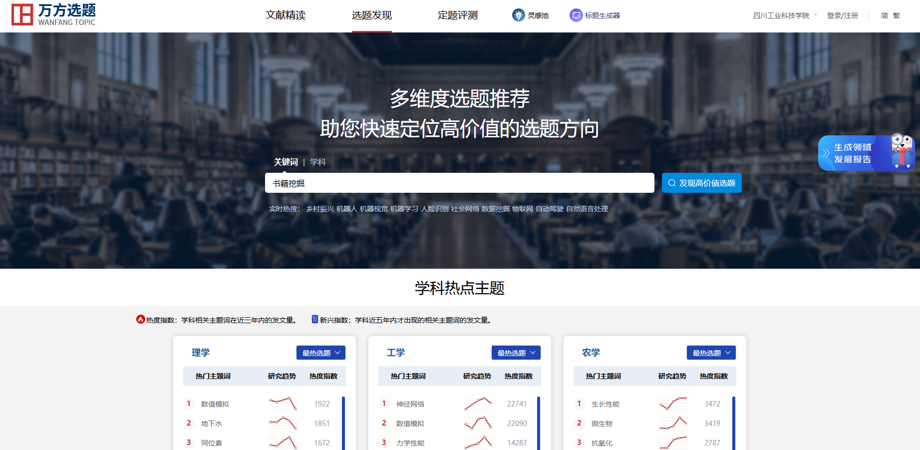 万方选题以万方数据库海量学术资源为基础,进行了分布式大数据云计算和智能语义分析,提供学科热点主题演化分析、前沿主题追踪、交叉学科探测、领域新兴主题挖掘等选题发现服务,以及高质量文献推荐和已定选题新颖性评测等服务。为具有科研立项、论文写作需求的学术研究人员提供选题解决方案。同时,指导学科管理人员把握学科的发展方向,支撑科研管理和学科建设。
