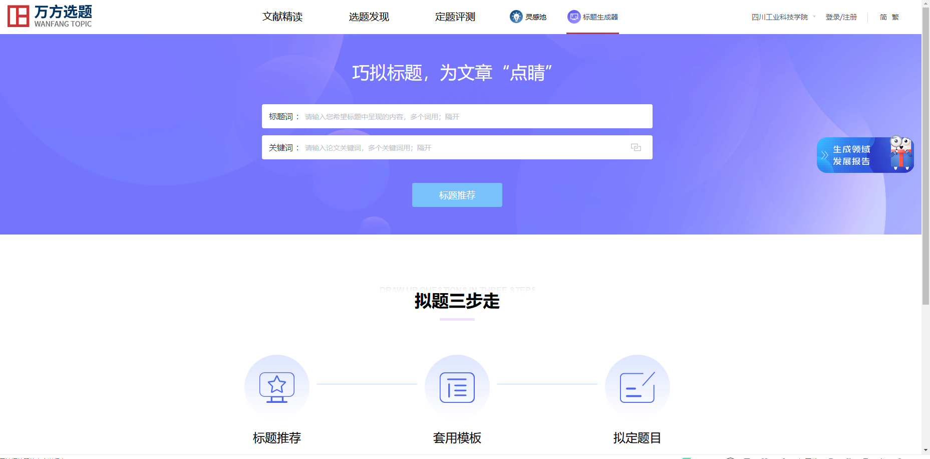 确定了选题方向,不知道怎样确定标题?——“标题生成器”功能提供核心期刊标题精准推荐与上百套核心期刊热门标题模板,还可一键保存标题并进行评测,助您确定一个合适的标题。