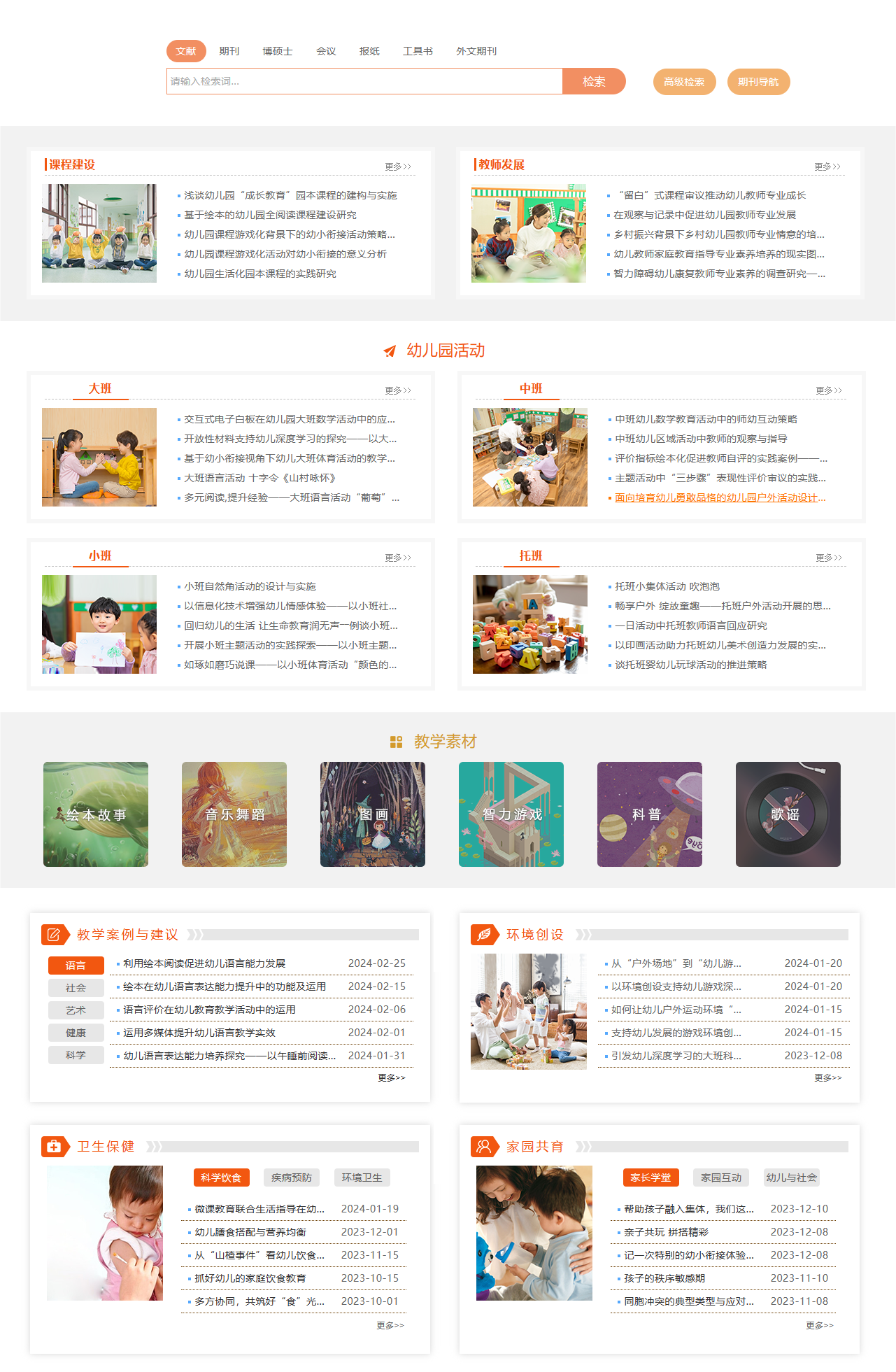 学前教育数字图书馆选编了期刊、报纸、博士、硕士、国内会议、国际会议、外文期刊、工具书以及部分政府官方的外网资源,为学前教育相关研究者提供教育学、心理学等方面的专业文献,为一线教师组织幼儿活动和教育教学提供绘本故事、儿童文学、科普、智力游戏、歌谣、音乐舞蹈、图画等常用素材。根据《3—6岁儿童学习与发展指南》为教师提供语言、社会、艺术、健康、科学教学案例和大中小托班相应年龄的活动组织指导。产品包括课题研究、专业发展、教师培训、心理健康等服务于教师的教科研与专业发展方面的文献,同时为幼儿园管理者提高管理水平提供政策解读、专家指导、教育思想以及管理方法等方面的文献支持。