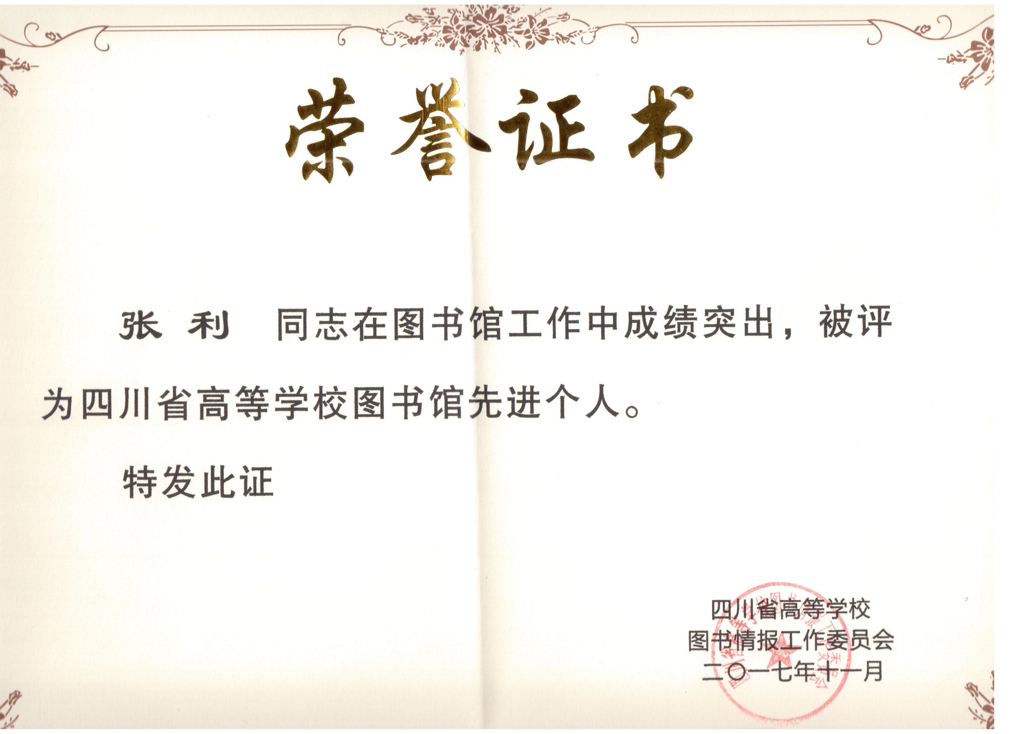 我馆张利同志荣获“四川省高等学校图书馆先进个人”称号