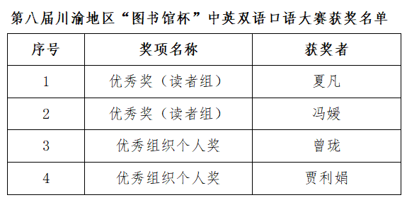 在第八届“悦读新时代”四川高校阅读文化节系列活动中,我校积极组织读者参与并取得了优异成绩。现将获奖师生名单公布如下: