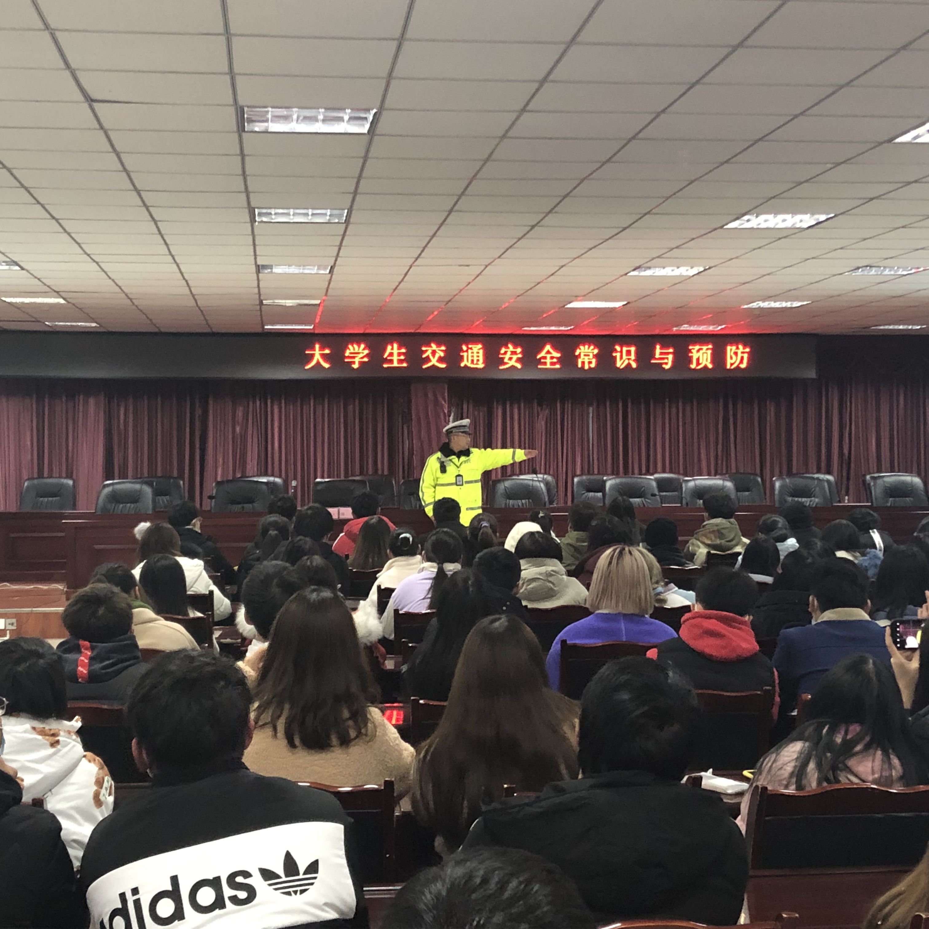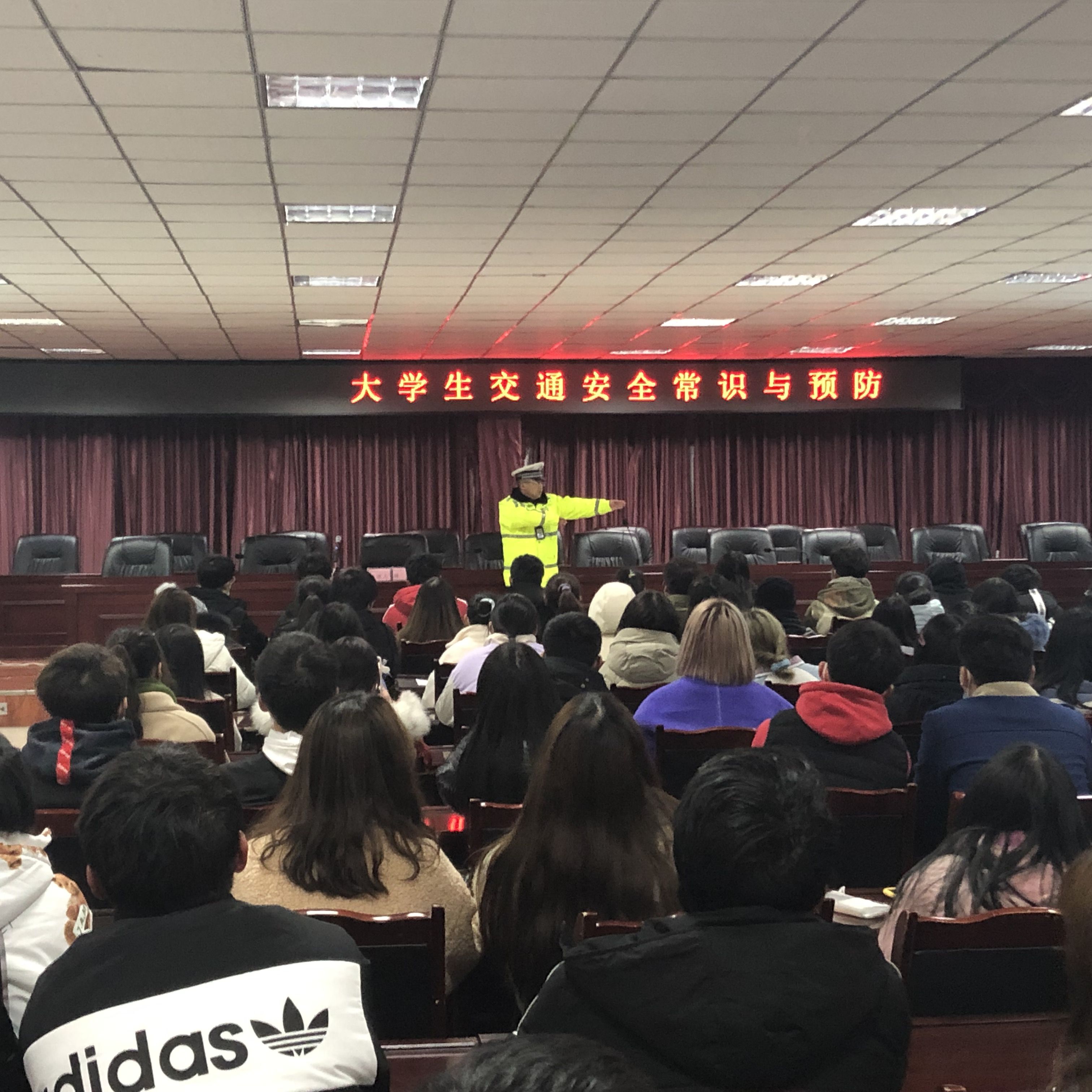 为进一步增强校内师生的交通安全意识,掌握交通安全知识,严格遵守交通法,不断提高自我保护能力,12月16日晚上7点20,罗江区交通管理部门的胡森警官在图书馆D08会议室展开了“大学生交通安全常识与预防”知识讲座,各班学生代表共计一百余人参加此次会议。