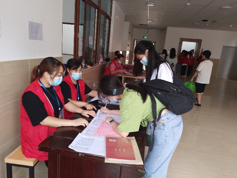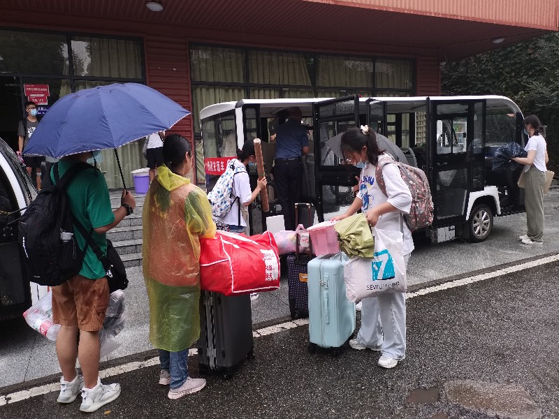 当校内中转车辆开至学生公寓时,学生处学生公寓管理科安排的学生志愿者早已在门口等候,做到贴心转运“无缝对接”。身着雨衣的“红马甲”迅速行动,你拉皮箱我扛包,在宿管工作人员协助下登记入住信息和领取宿舍钥匙后,新生便在学长和学姐的无限呵护中迈入大学生活区,开启属于自己的独特大学生活。