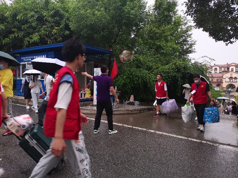 行李寄存处人头攒动,持续不断的蒙蒙细雨丝毫影响不到校园“红马甲”帮助新生搬运行李的热情。待新生办理完结所有的入学报到手续后,学生志愿者们便主动上前将新生携带的行囊从行李寄存处搬运至校内新生转运专车处,学生处王波老师和陈财老师在熙熙攘攘的行李搬运道路上有条不紊地引导着,“到龑江公寓的走这边,到骄子公寓的走那边”。