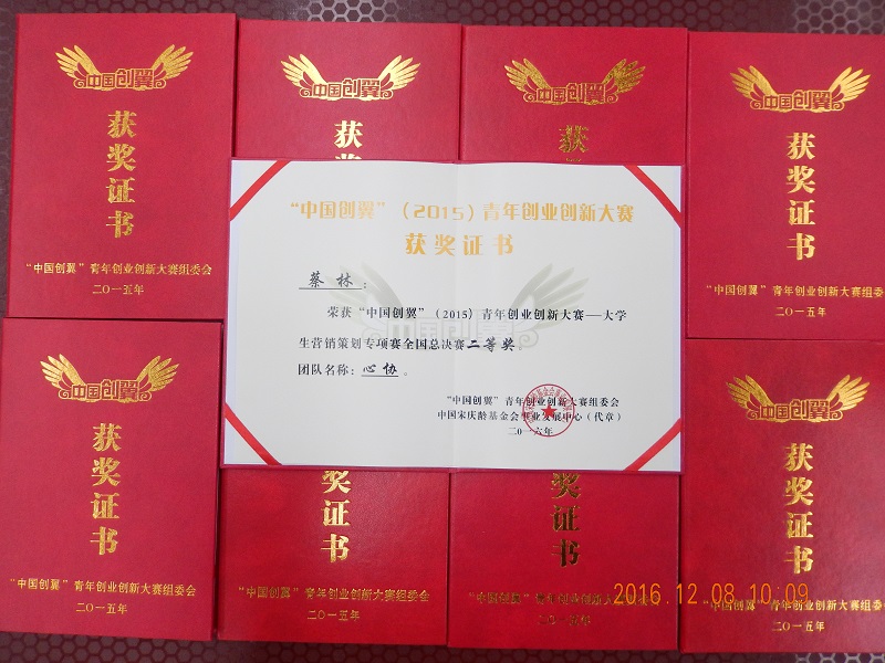 近日,由中国宋庆龄基金会和人力资源社会保障部共同主办的“中国创翼”青年创业创新大赛专项赛事首届大学生营销策划赛落下帷幕。我校心理协会成员2014级物流管理本科1班杨飞虎、2014级汽车营销2班陈涛等8位同学在心理协会指导老师蔡林的指导下荣获全国二等奖。