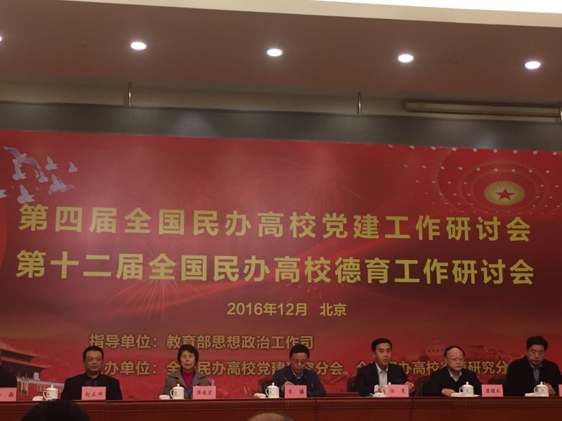 12月6日至7日,由教育部思想政治工作司指导、全国民办高校党建研究分会、全国民办高校德育研究分会主办的第四届全国民办高校党建工作研讨会暨第十二届全国民办高校德育工作研讨会在北京会议中心召开,来自全国26个省市的238所高校党委书记、校长、德育负责人参加了大会。我校是全国民办高校党建研究分会副理事长单位,党委书记、校长唐健禾和学工部副部长胡亮同志应邀参加大会,唐健禾教授并在主席台前台就座。