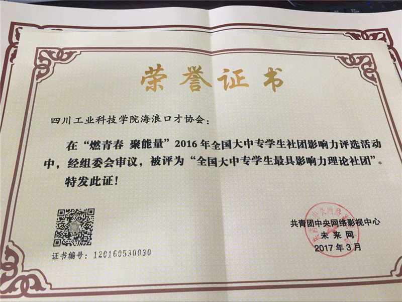 四川工业科技学院海浪口才协会,荣获“全国大中专学生社团最具影响力理论社团”;