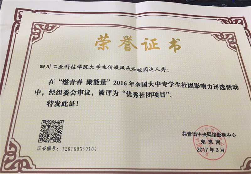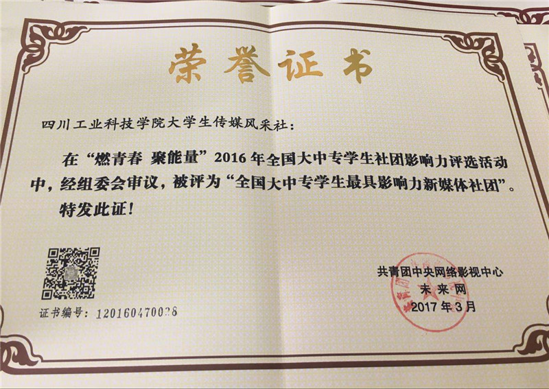 四川工业科技学院大学生传媒风采社,荣获“全国大中专学生社团最具影响力新媒体社团”;