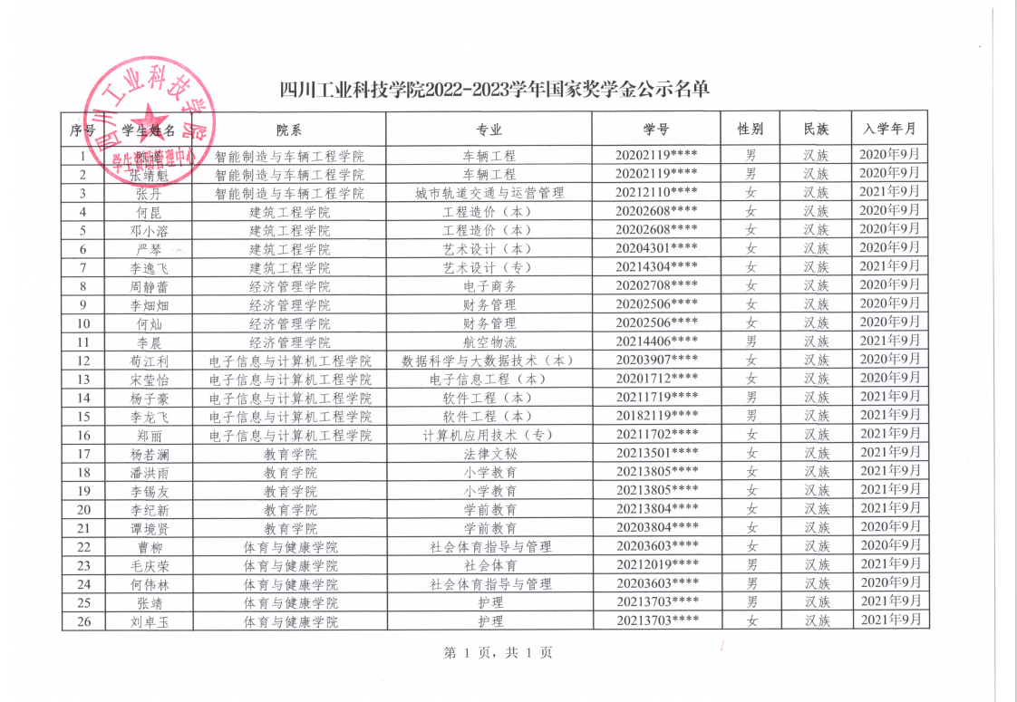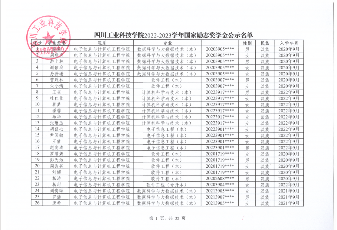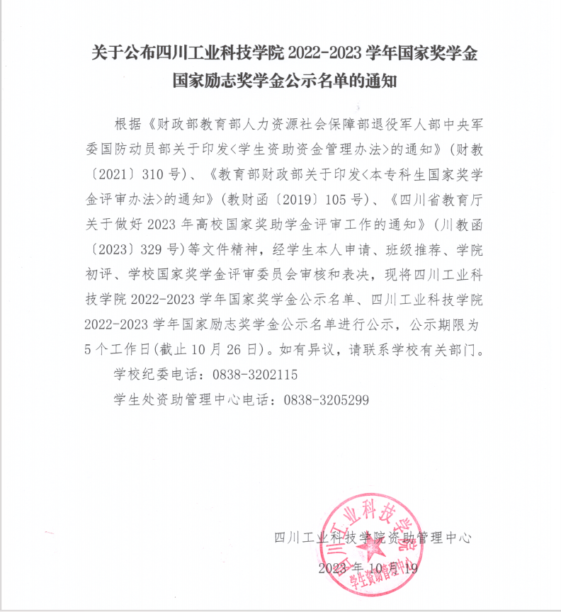 关于公布四川工业科技学院2022-2023学年国家奖学金 国家励志奖学金公示名单的通知