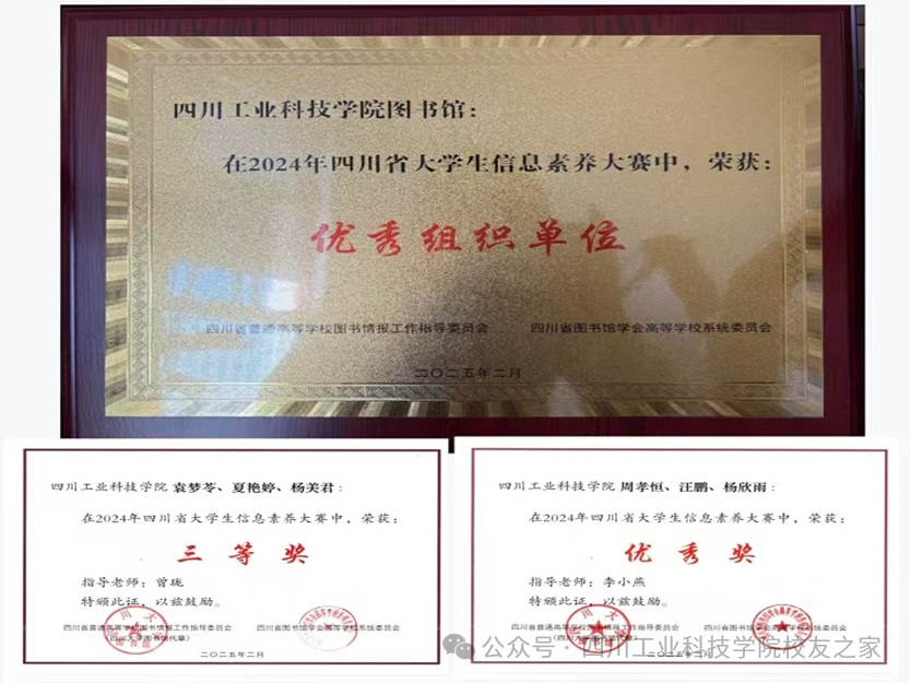 四川省普通高等学校图书情报工作指导委员会公布了2024年四川省大学生信息素养大赛获奖名单。学校5支队伍成功晋级省赛并取得优异成绩:1支队伍获三等奖,4支队伍获优秀奖。同时,学校图书馆荣获“优秀组织单位奖”。