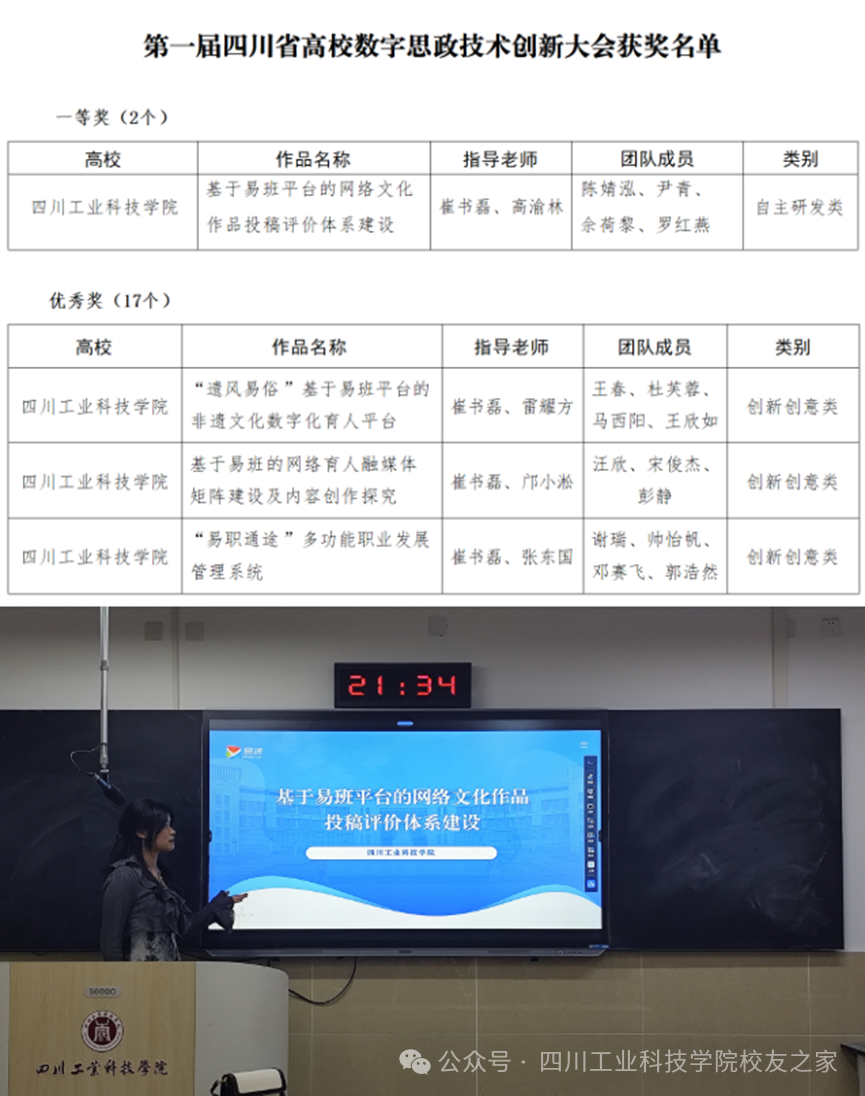 四川省教育厅易班建设与发展中心公布了第一届四川省高校数字思政技术创新大会获奖名单,学校《基于易班平台的网络文化作品投稿评价体系建设》项目斩获一等奖,非遗文化数字化育人平台、网络育人融媒体矩阵建设及职业发展管理系统三项成果获评优秀奖,展现了学校在数字思政领域的创新活力。
