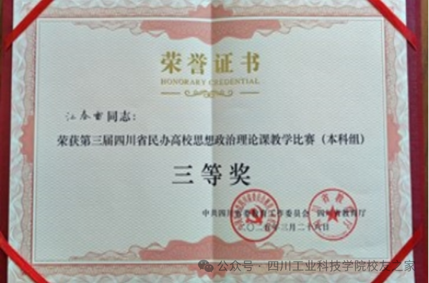 马克思主义学院教师江春雷在第三届四川省民办高校思想政治理论课教学比赛中荣获三等奖。