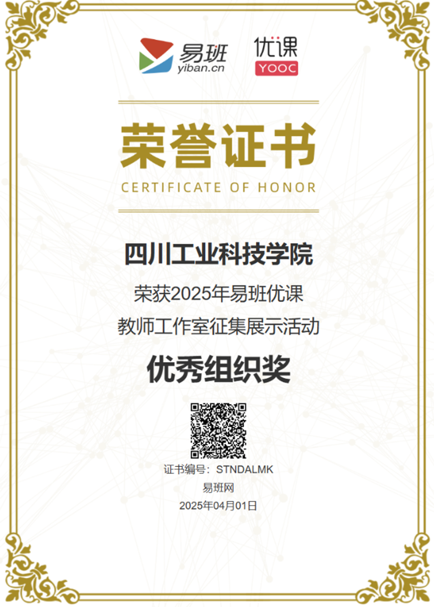 教育部易班网公布2025年度易班优课教师工作室征集展示活动评选结果,四川工业科技学院荣获“优秀组织奖”,雷耀方、高渝林、崔书磊荣获优秀指导教师。
