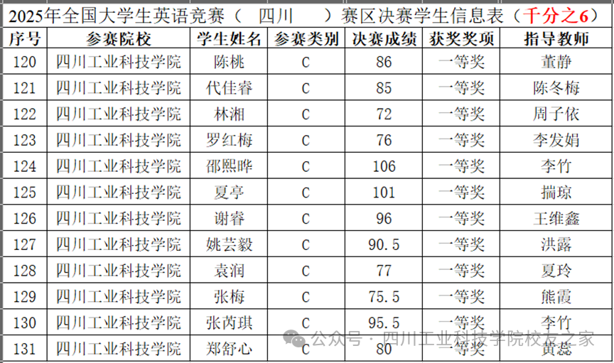 5月11日,2025年全国大学生英语竞赛(National English Competition for College Students, 简称NECCS)四川省决赛在四川大学江安校区举行。学校12名参赛学生荣获省级一等奖。
