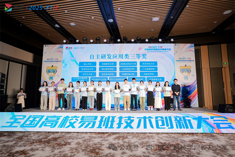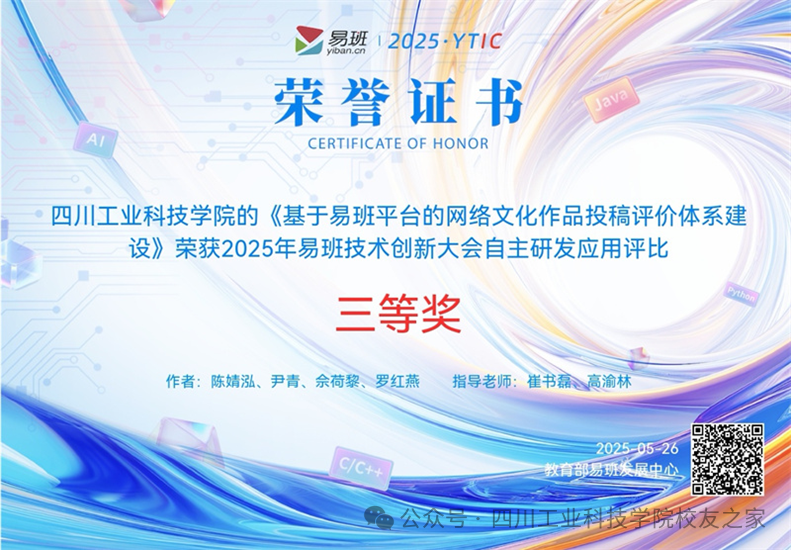 5月26日,教育部易班发展中心主办的2025年全国高校易班技术创新大会在珠海圆满落幕。由崔书磊、高渝林老师指导,陈婧泓、尹青、佘荷黎、罗红燕四位同学完成的《基于易班平台的网络文化作品投稿评价体系建设》项目荣获自主研发应用全国三等奖。