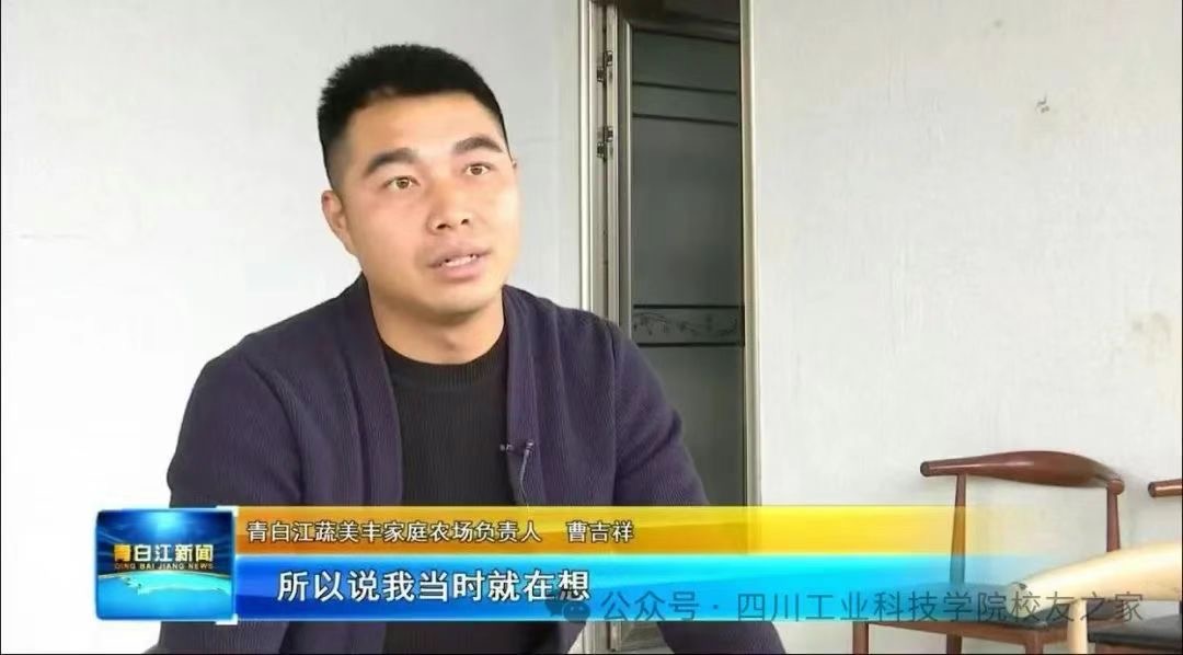 毕业后,曹吉祥先后辗转不同岗位,但创业的梦想从未熄灭。2020年,从事物流运输的他,在往返青白江区蔬菜基地的过程中,凭借在母校培养的敏锐市场洞察力,发现了现代农业发展的巨大商机。次年,他毅然投身农业,在20余亩的大棚里播下了希望的种子。虽然创业初期困难重重,但他咬牙坚持,第一年种植的小白菜就收获20多万元,这份成绩不仅是对他眼光的认可,更坚定了他深耕农业的决心。