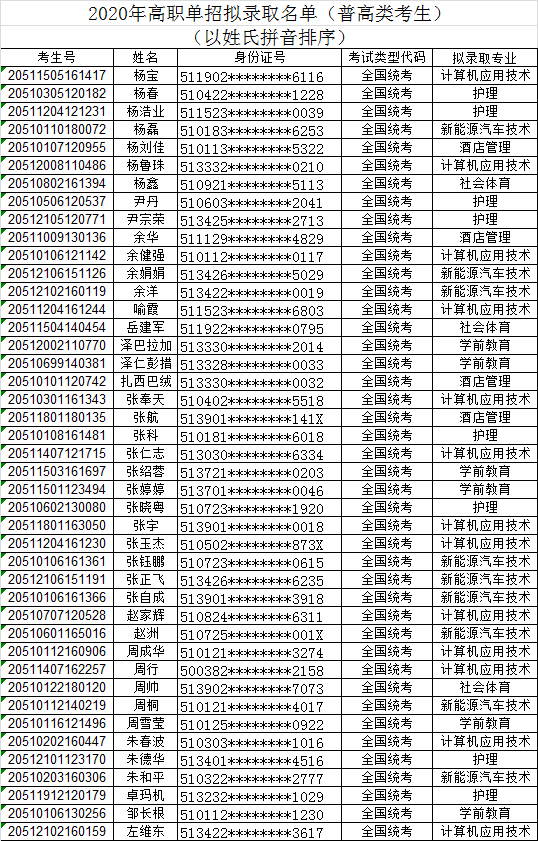 公示时间:6月4日17:00——6月8日17:00。在拟录取名单公示期间,如有自愿放弃单独招生录取资格的考生,须于6月8日12点前将“自愿放弃录取申请书”和本人身份证复印件及联系方式,发送至邮箱35343717@qq.com,否则视为同意我校录取。被我校高职单招录取的考生,将不再参加2020年普通高考及对口高职招生考试。