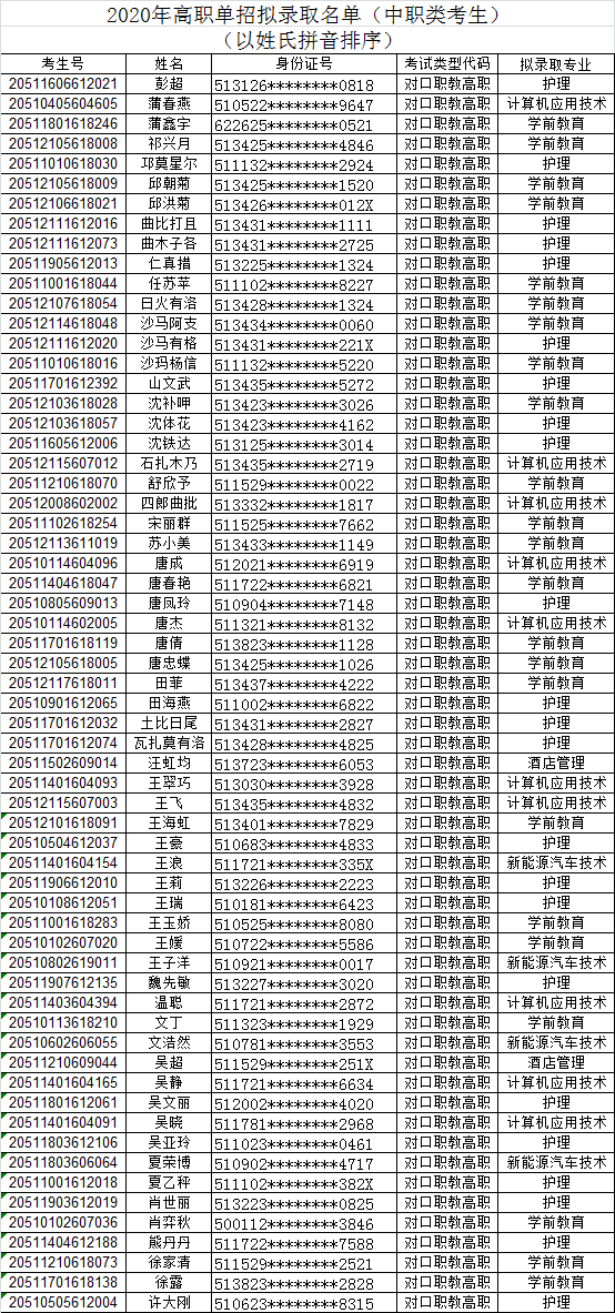 四川工业科技学院2020年高职单招考试拟录取名单公示